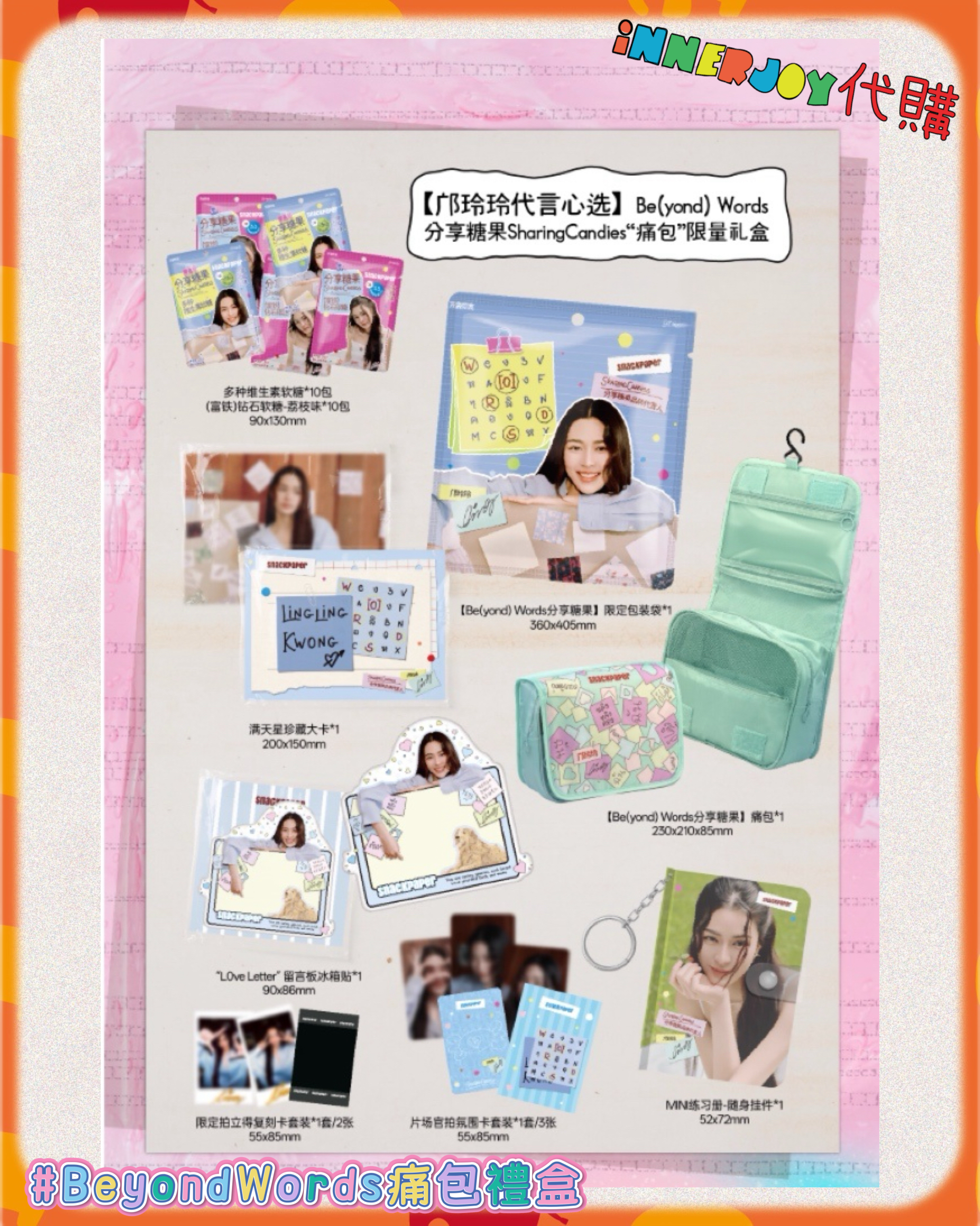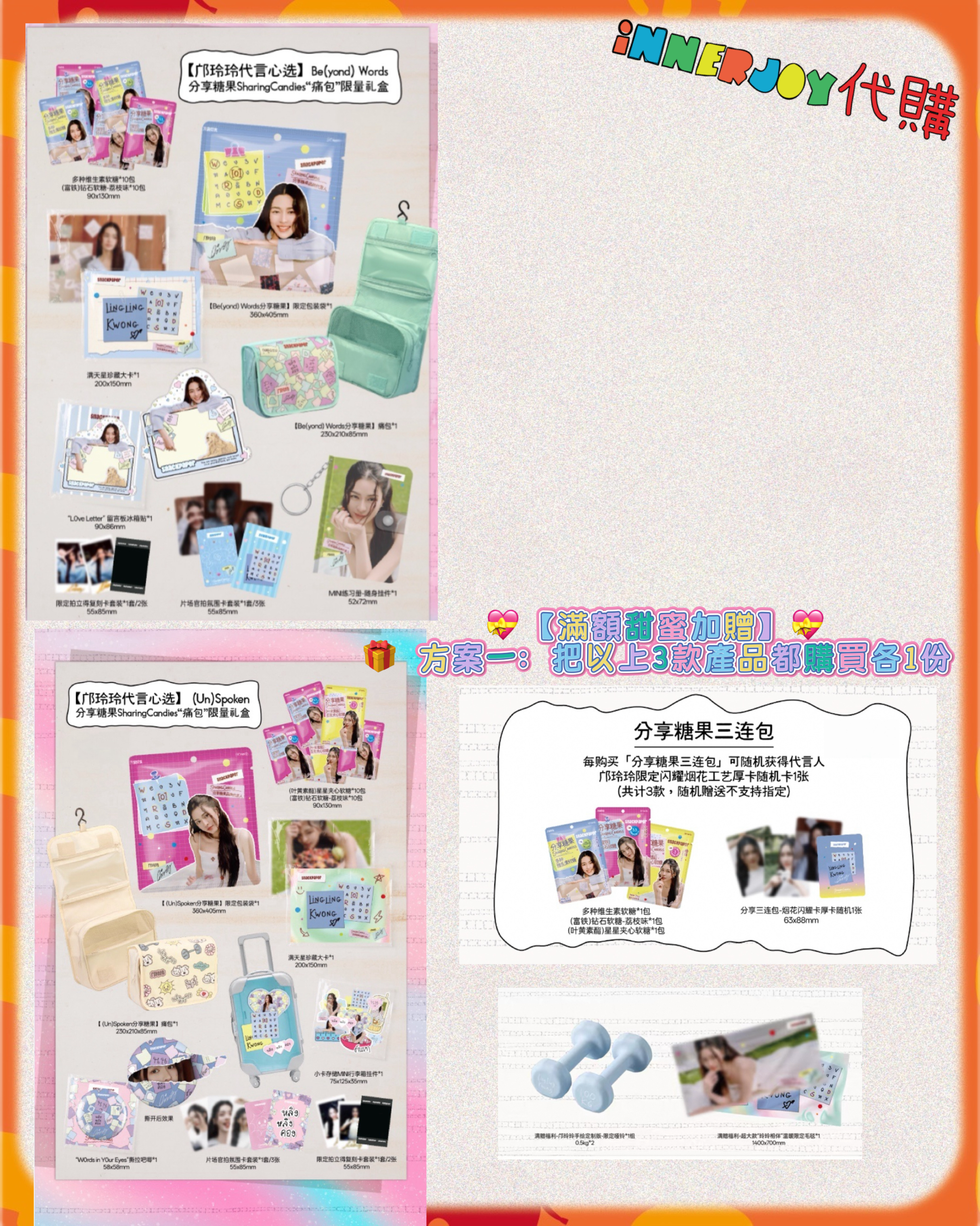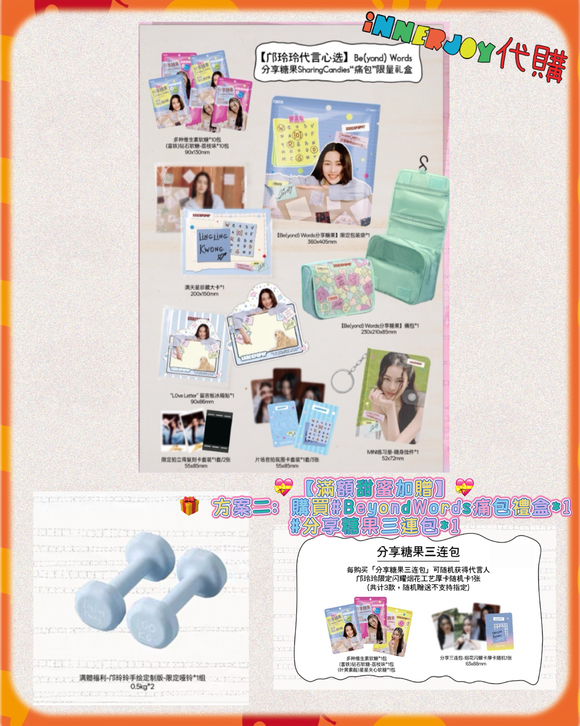 預購 |LingOrm - LingLing 最新代言🍬分享糖果SharingCandies 限量禮盒🎁 【✨限量商品如未能成功搶購將於七天內退款✨】 【💖限定登場!玲玲的甜蜜詞語軟糖~一起把心裏話含在嘴裏🍬】 還記得玲玲在泰國生活時,每個學會的新詞語都像談了一場戀愛般悸動嗎?✨ 現在,這份甜甜的成長回憶變成能握在手心裡的軟糖啦~ 每一顆都是玲玲與你們之間的小秘密㊙️ 【🎀玲玲の甜蜜收藏館|三款心動選擇 把可愛統統帶回家~】 🌸第一款:#Unspoken痛包禮盒 ✨軟糖組合: • 星星夾心軟糖 ×10包 • 鑽石荔枝軟糖 ×10包 ✨周邊收藏: • Unspoken限定包裝袋 ×1個 • 滿天星珍藏大卡 ×1張 • Unspoken痛包 ×1個 • Words in Your Eyes撕拉貼 ×1張 • 片場官拍氣氛卡 ×3張 • 限定拍立得復刻卡 ×2張 • 小卡儲存MINI行李箱掛件 ×1個 🌸第二款:#BeyondWords痛包禮盒 ✨軟糖組合: • 多種維生素軟糖 ×10包 • 鑽石荔枝軟糖 ×10包 ✨周邊收藏: • Beyond Words限定包裝袋 ×1個 • 滿天星珍藏大卡 ×1張 • Beyond Words痛包 ×1個 • Love Letter留言板冰箱貼 ×1張 • 限定拍立得復刻卡 ×2張 • 片場官拍氣氛卡 ×3張 • MINI練習本隨身掛件 ×1個 🌸第三款:#分享糖果三連包 ✨軟糖組合: • 多種維生素軟糖 ×1包 • 鑽石荔枝軟糖 ×1包 • 星星夾心軟糖 ×1包 ✨隨機贈送: • 玲玲限定閃耀煙火厚卡 ×1張 (共3款隨機,63×88mm) 💝【滿額甜蜜加贈】💝 🎁 方案一:把以上3款產品都購買各1份 ✨ 即可獲得: • 玲玲手繪定制版限定啞鈴 ×1組(0.5kg×2) • 超大款「玲玲相伴」溫暖限定毛毯 ×1條(1400×700mm) 🎁 方案二:購買#Unspoken痛包禮盒*1 或 #BeyondWords痛包禮盒*1+#分享糖果三連包*1 ✨ 即可獲得: • 玲玲手繪定制版限定啞鈴 ×1組(0.5kg×2) 💝收藏重點: ▹ 每款都有玲玲精心準備的營養軟糖 ▹ 精緻周邊隨時陪伴在你身邊 ▹ 隨機小卡讓每次打開都是驚喜 「把玲玲的甜蜜祝福裝進包包裡,讓每一天都閃閃發亮~」 現在就選擇你最心動的組合 讓這些可愛小物陪伴你的每個日常時刻✨ 📌 International Customers Notice: If you are unsure about any product details, please contact us before placing your order. We’re happy to assist you! 📍書刊注意:產品可能會因運送過程有不可避免的磕碰或折角,如介意請慎買。📍 📍最終解釋權均歸官方所有📍 ⚠️備註:裝置屏幕顯示與拍攝時的顏色可能有差異,實際產品和參考圖片可能略有不同,望知悉。 ✨由於匯率浮動,價格有機會有所更改,敬請注意 🔸🔸🔸 Deadline|截止 : 每日一截,售完即止 Earliest Delivery 預計最早發貨:預購結束後一個月,如有更改將於限時動態(Story)內公佈 ■ 歡迎團購/合單|Group order is available. DM for details 凡購買 10 件以上,可領取團購優惠,歡迎粉絲和各大Fansclub查詢 🔸🔸🔸 書刊購買須知: ⭐運送過程中雜誌可能會有不可避免的磕碰折角,出版商可不作售後更換,如介意請慎買。 ⭐出版商可能隨時改動書本設計和內容, InnerjoyThailand不作另行通知 ⭐內地雜誌出現需要售後的情況較多和部分銷售方有機會不提供售後或走數,請細閱網站內代購條款之圖片,下單即視為同意和知悉相關情況。 ⚠️備註:裝置屏幕顯示與拍攝時的顏色可能有差異,實際產品和參考圖片可能略有不同,望知悉。 🔸🔸🔸 ✨The product content is for reference only, and subject to the actual official sales situation. 📍商品內容僅供參考,一切以官方銷售實際情況作準。 ✨代購價格已包含泰國-香港路段國際郵費,香港本地可順豐到付,或到葵廣/旺角中心格仔鋪領取 ✨信用卡/八達通/ AlipayHK/WechatPay/Tap&Go/PayMe/ApplePay/GooglePay/Paypal/FPS/銀行轉帳✨ 🟠🟠🟠 Disclaimer: If the posting content infringes or violates your copyrights, please contact us immediately. 本公司並沒有持有任何品牌之版權,所有商標及版權均屬該品牌持有人,圖片及資料轉載只作分享用途,敬請留意。