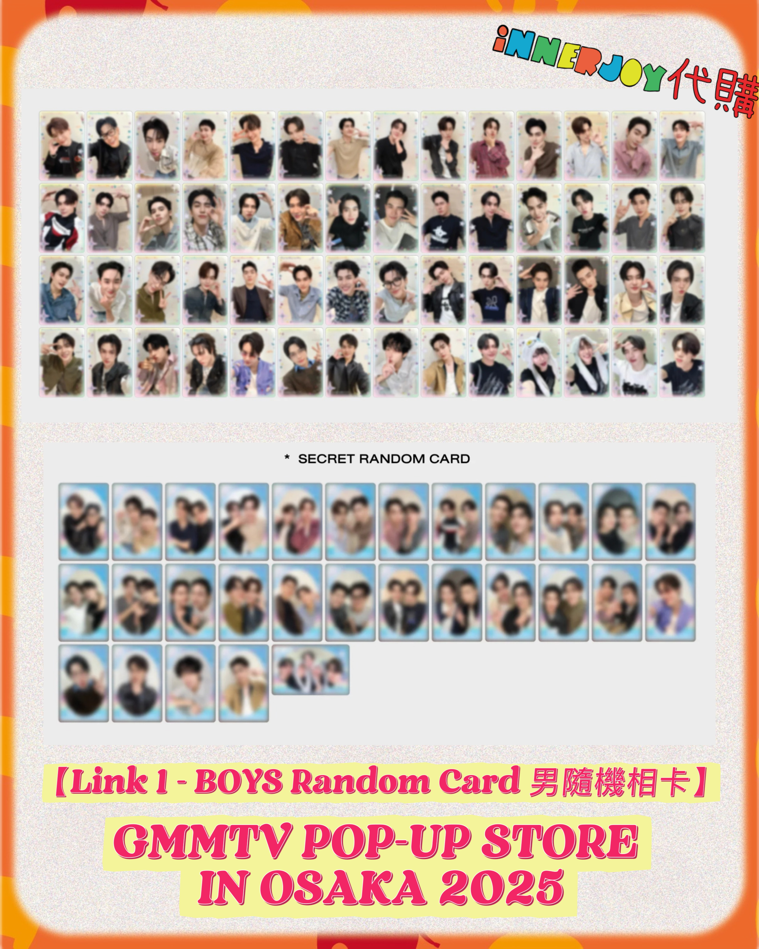 日本代購【Link 1 - BOYS Random Card 男隨機相卡】 | GMMTV POP-UP STORE IN OSAKA 2025 GMMTV OFFICIAL MERCHANDISE GMM 官方周邊 【商品內容】 🔸BOYS SELFIE RANDOM CARD (3pcs),共85款 🔸指定藝人相卡 📌 International Customers Notice: If you are unsure about any product details, please contact us before placing your order. We’re happy to assist you! 📍書刊注意:產品可能會因運送過程有不可避免的磕碰或折角,如介意請慎買。📍 📍最終解釋權均歸官方所有📍 ⚠️備註:裝置屏幕顯示與拍攝時的顏色可能有差異,實際產品和參考圖片可能略有不同,望知悉。 ✨由於匯率浮動,價格有機會有所更改,敬請注意 🔸🔸🔸 Deadline|截止 : 24/11/2025 18:00 Earliest Delivery 預計最早發貨:End of Dec 12月下旬,如有更改將於限時動態(Story)內公佈 ■ 歡迎團購/合單|Group order is available. DM for details 凡購買 10 件以上,可領取團購優惠,歡迎粉絲和各大Fansclub查詢 🔸🔸🔸 書刊購買須知: ⭐運送過程中雜誌可能會有不可避免的磕碰折角,出版商可不作售後更換,如介意請慎買。 ⭐出版商可能隨時改動書本設計和內容, InnerjoyThailand不作另行通知 ⭐內地雜誌出現需要售後的情況較多和部分銷售方有機會不提供售後或走數,請細閱網站內代購條款之圖片,下單即視為同意和知悉相關情況。 ⚠️備註:裝置屏幕顯示與拍攝時的顏色可能有差異,實際產品和參考圖片可能略有不同,望知悉。 🔸🔸🔸 ✨The product content is for reference only, and subject to the actual official sales situation. 📍商品內容僅供參考,一切以官方銷售實際情況作準。 ✨代購價格已包含泰國-香港路段國際郵費,香港本地可順豐到付,或到葵廣/旺角中心格仔鋪領取 ✨信用卡/八達通/ AlipayHK/WechatPay/Tap&Go/PayMe/ApplePay/GooglePay/Paypal/FPS/銀行轉帳✨ 🟠🟠🟠 Disclaimer: If the posting content infringes or violates your copyrights, please contact us immediately. 本公司並沒有持有任何品牌之版權,所有商標及版權均屬該品牌持有人,圖片及資料轉載只作分享用途,敬請留意。