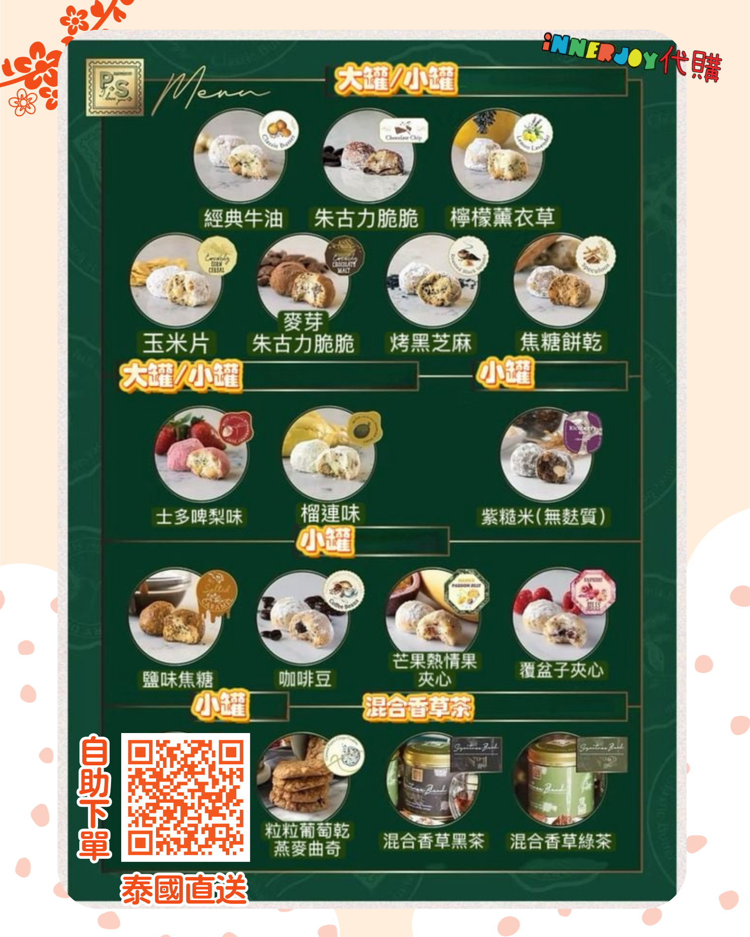 泰國團購|PS I Love You 波波曲奇 新一團上架 🍪 17/10 截單 23/10發貨 ❤️🔥新增多買多優惠❤️🔥 ⚠️商品鐵罐及貼紙容易凹陷及斷開,下單前請謹慎考慮。⚠️ ⚠️如需紙袋請下單時備註紙袋數量⚠️ ❤️🔥【新口味】 🍪 Nutella Dust with Cocoa&Milo 三重可可❤️🔥 🍪 Unicorn Ispahan Jelly(Raspberry+Lychee+Rose)荔枝覆盆子玫瑰夾心 ❤️🔥 泰國本土品牌🍪大熱波波曲奇🍪 ❌不含反式脂肪 ❌無添加防腐劑 ✅加上濃濃嘅牛油曲奇香 ✅絕對會令人停不下來 【選擇內容】 💗單罐 💗新增多買多優惠 🍽 口味可選: 🍪 Classic Butter 經典牛油 🍪 Lemon Lavender 檸檬薰衣草 🍪 Chocolate Chip 朱古力脆脆 🍪 Crunchy Corn Cereal 玉米片 🍪 Crunchy Chocolate Malt 麥芽朱古力脆脆 🍪 Speculoos 焦糖餅乾 🍪 Roasted Black Seasames烤黑芝麻 🍪 Strawberry Dust 士多啤梨味 🍪 Durian Dust 榴槤味 🍪 Salted Caramel 鹽味焦糖 🍪 Riceberry 紫糙米 (無麩質) 🍪 Coffee Beans 咖啡豆 🍪 Mango Passion Jelly 芒果熱情果 ❤️🔥 🍪 Raspberry Jelly 覆盆子夾心 ❤️🔥 🍪 Peanut Butter 花生醬 ❤️🔥 🍪 Nutella Dust with Cocoa&Milo 三重可可❤️🔥 🍪 Unicorn Ispahan Jelly(Raspberry+Lychee+Rose)荔枝覆盆子玫瑰夾心 ❤️🔥 【 以下商品沒有尺寸選擇 No Size 】 🍪 Oatmeal Raisin Cookie 粒粒葡萄乾燕麥曲奇 🍿Miso Caramel Popcorn 焦糖爆谷 ❌ 停產 🫖Signature Blend no.1 混合香草黑茶✨溫暖順喉,舒緩喉嚨不適之選✨ (內含:黑茶、白玫瑰、雲尼拿、薰衣草、薄荷、芒果) 🫖Signature Blend no.2 混合香草綠茶✨酸酸甜甜,下午茶首選✨ (內含:綠茶、梨、布冧、蘋果、茉莉) ⚠️ 本產品含有堅果類、麩質穀物、奶類,不適合對其過敏體質者食用 ,敬請留意 ⚠️ 📍 保存方法:不打開密封包裝或存放於密封容器中,在室溫下最多可保存兩個月 ✨曲奇建議盡快取貨;選順豐會到貨即發,不額外儲貨喔~ ✨價格:已包含泰國本地運輸&至香港的國際郵費,及所有包裝費用 ✨可旺角中心/葵廣格仔鋪領取;順豐到付✨ 🔸🔸🔸 Deadline|截止 : 17/10/2025 18:00 Earliest Delivery 預計發貨:10月23日,敬請確保10月23日附近的日子能夠在港收貨,如有延期歡迎告知 🔸🔸🔸 ✨The product content is for reference only, and subject to the actual official sales situation. 商品內容僅供參考,一切以官方銷售實際情況作準。✨ ✨代購價格已包含泰國-香港國際郵費,本地郵費到付 ✨接納各平台電子付款 🔸🔸🔸 ⚠️溫馨提示⚠️ 由於匯率浮動,價格有機會有所更改,敬請注意 購買前請閱讀網站置頂之「退貨及退款政策」 客人提交訂單後,視為知悉海關抽查之可能情況並同意政策。 海關抽查檢驗時,包裝會因海關打開而有機會出現破損,本店不會為海關檢查造成的各種情況與問題負責,敬請諒解。 預售產品及代購訂單不接受任何因素退款或退貨,為保障雙方,開箱前可全程開始拍影片檢視貨品狀況。 食物產品由於衛生問題,開封後不接受任何退換或退款。 Disclaimer: If the posting content infringes or violates your copyrights, please contact us immediately. 本公司並沒有持有任何品牌之版權,所有商標及版權均屬該品牌持有人,圖片及資料轉載只作分享用途,敬請留意。