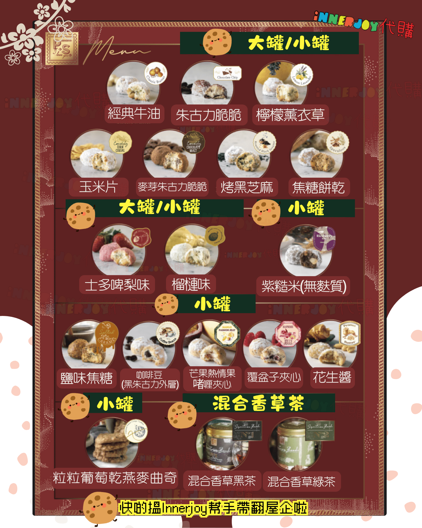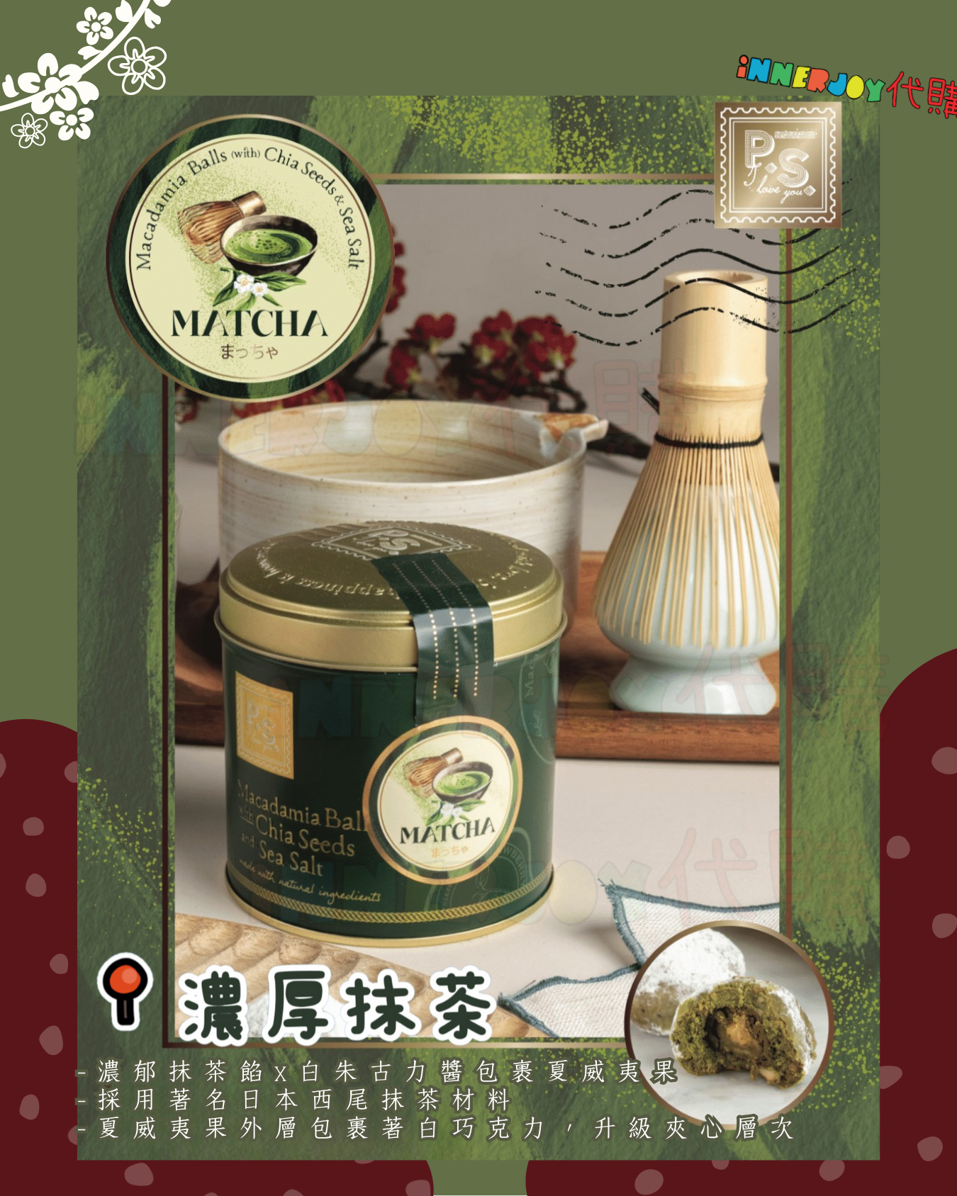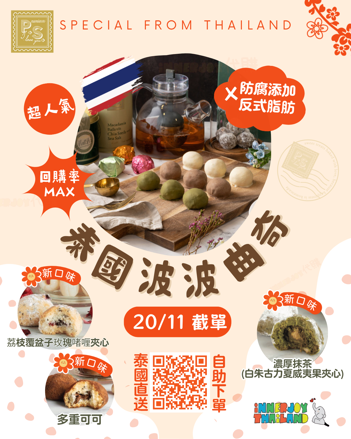 泰國團購|PS I Love You 波波曲奇 新一團上架 🍪 20/11 截單 25/11發貨 ❤️🔥新增多買多優惠❤️🔥 ⚠️商品鐵罐及貼紙容易凹陷及斷開,下單前請謹慎考慮。⚠️ ⚠️如需紙袋請下單時備註紙袋數量⚠️ ❤️🔥【新口味】 🍪 Nutella Dust with Cocoa & Milo 三重可可❤️🔥 🍪 Unicorn Ispahan Jelly(Raspberry+Lychee+Rose)荔枝覆盆子玫瑰夾心 ❤️🔥 🍪 Matcha 抹茶 -濃郁抹茶餡x白朱古力醬包裹夏威夷果 -採用著名日本西尾抹茶材料 -夏威夷果外層包裹著白巧克力,升級夾心層次 泰國本土品牌🍪大熱波波曲奇🍪 ❌不含反式脂肪 ❌無添加防腐劑 ✅加上濃濃嘅牛油曲奇香 ✅絕對會令人停不下來 【選擇內容】 💗單罐 💗新增多買多優惠 🍽 口味可選: 🍪 Classic Butter 經典牛油 🍪 Lemon Lavender 檸檬薰衣草 🍪 Chocolate Chip 朱古力脆脆 🍪 Crunchy Corn Cereal 玉米片 🍪 Crunchy Chocolate Malt 麥芽朱古力脆脆 🍪 Speculoos 焦糖餅乾 🍪 Roasted Black Seasames烤黑芝麻 🍪 Strawberry Dust 士多啤梨味 🍪 Durian Dust 榴槤味 🍪 Salted Caramel 鹽味焦糖 🍪 Riceberry 紫糙米 (無麩質) 🍪 Coffee Beans 咖啡豆 🍪 Mango Passion Jelly 芒果熱情果 ❤️🔥 🍪 Raspberry Jelly 覆盆子夾心 ❤️🔥 🍪 Peanut Butter 花生醬 ❤️🔥 🍪 Nutella with cocoa powder 榛子可可二重奏❤️🔥 🍪 Unicorn Ispahan Jelly(Raspberry+Lychee+Rose)荔枝覆盆子玫瑰夾心 ❤️🔥 🍪 Matcha 抹茶 【 以下商品沒有尺寸選擇 No Size 】 🍪 Oatmeal Raisin Cookie 粒粒葡萄乾燕麥曲奇 🍿Miso Caramel Popcorn 焦糖爆谷 ❌ 停產 🫖Signature Blend no.1 混合香草黑茶✨溫暖順喉,舒緩喉嚨不適之選✨ (內含:黑茶、白玫瑰、雲尼拿、薰衣草、薄荷、芒果) 🫖Signature Blend no.2 混合香草綠茶✨酸酸甜甜,下午茶首選✨ (內含:綠茶、梨、布冧、蘋果、茉莉) ⚠️ 本產品含有堅果類、麩質穀物、奶類,不適合對其過敏體質者食用 ,敬請留意 ⚠️ 📍 保存方法:不打開密封包裝或存放於密封容器中,在室溫下最多可保存兩個月 ✨曲奇建議盡快取貨;選順豐會到貨即發,不額外儲貨喔~ ✨價格:已包含泰國本地運輸&至香港的國際郵費,及所有包裝費用 ✨可旺角中心/葵廣格仔鋪領取;順豐到付✨ 🔸🔸🔸 Deadline|截止 : 20/11/2025 18:00 Earliest Delivery 預計發貨:10月25日,敬請確保11月25日附近的日子能夠在港收貨,如有延期歡迎告知 🔸🔸🔸 ✨The product content is for reference only, and subject to the actual official sales situation. 商品內容僅供參考,一切以官方銷售實際情況作準。✨ ✨代購價格已包含泰國-香港國際郵費,本地郵費到付 ✨接納各平台電子付款 🔸🔸🔸 ⚠️溫馨提示⚠️ 由於匯率浮動,價格有機會有所更改,敬請注意 購買前請閱讀網站置頂之「退貨及退款政策」 客人提交訂單後,視為知悉海關抽查之可能情況並同意政策。 海關抽查檢驗時,包裝會因海關打開而有機會出現破損,本店不會為海關檢查造成的各種情況與問題負責,敬請諒解。 預售產品及代購訂單不接受任何因素退款或退貨,為保障雙方,開箱前可全程開始拍影片檢視貨品狀況。 食物產品由於衛生問題,開封後不接受任何退換或退款。 Disclaimer: If the posting content infringes or violates your copyrights, please contact us immediately. 本公司並沒有持有任何品牌之版權,所有商標及版權均屬該品牌持有人,圖片及資料轉載只作分享用途,敬請留意。