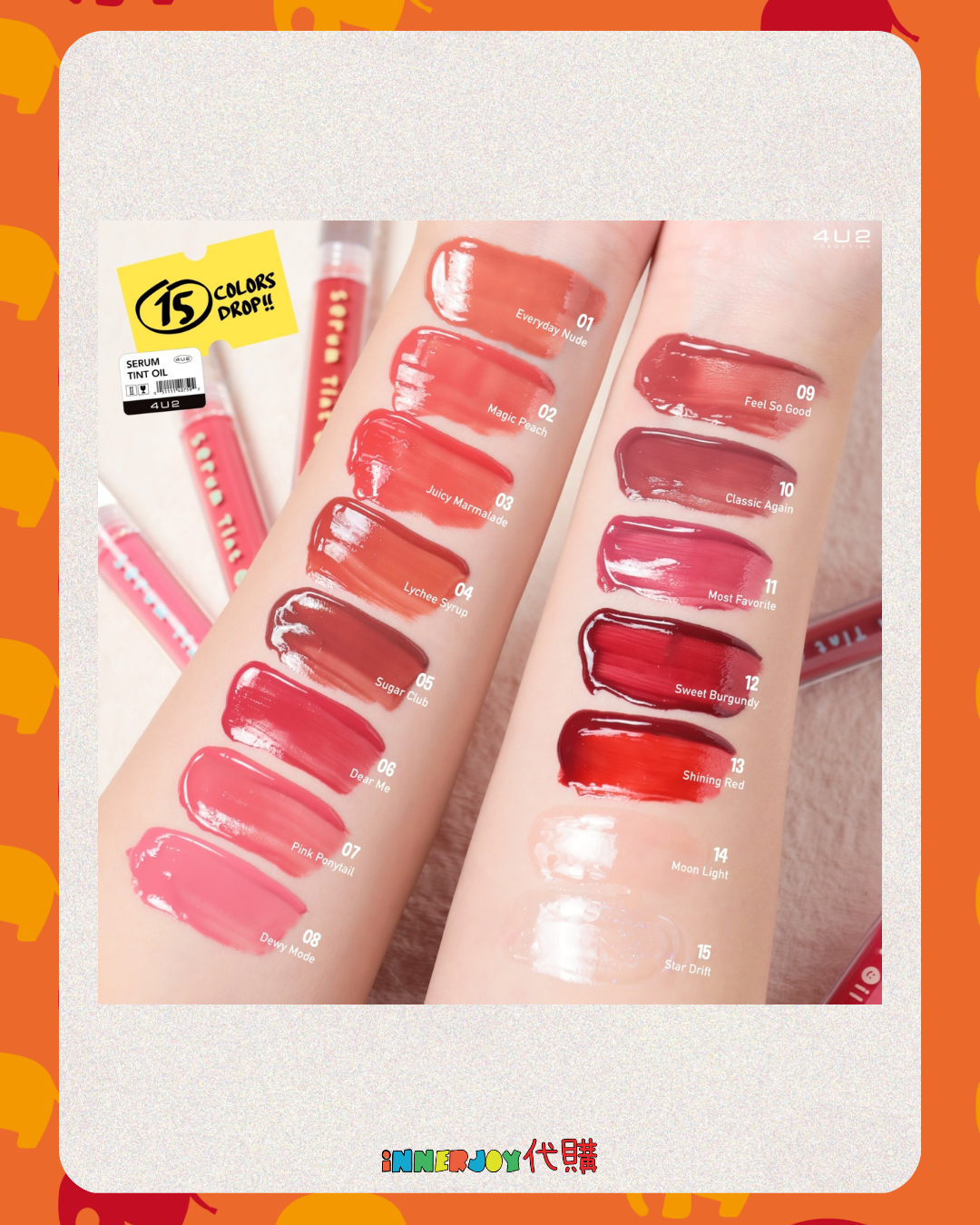 泰國彩妝(下單後7-14天到港) | 4U2 SERUM TINT OIL 唇油 ⚠️限香港地區下單⚠️ 4U2 SERUM TINT OIL 唇油 —— 質感如糖漿般水潤,令雙唇光澤飽滿,展現健康水嫩效果。 水潤回歸「Come Back」 全新升級,更加閃亮,持久度提升 1000%。 4U2 SERUM TINT OIL 人氣唇彩強勢回歸,備受喜愛的「水潤唇」效果再度升級。 全新版本 —— 光澤更強、水潤更顯著,持久度再度提升。 #糖漿唇彩,水潤效果如每日飲足 10 公升水! 乾唇女生必備,輕輕一抹即可令雙唇飽滿 Juicy,質感順滑不黏膩,瞬間打造健康水嫩光澤。 令雙唇水潤欲滴,散發迷人魅力。 色號選擇: #01 Everyday Nude —— 柔和橙調蜜桃裸色 #02 Magic Peach —— 橙粉調蜜桃色 #03 Juicy Marmalade —— 橙色系 #04 Lychee Syrup —— 橙棕調裸色 #05 Sugar Club —— 紅棕裸色 #06 Dear Me —— 明亮草莓粉色 #07 Pink Ponytail —— 蜜桃粉色 #08 Dewy Mode —— Barbie 粉色 #09 Feel So Good —— 低調柔和粉色 #10 Classic Again —— 粉紫裸色 #11 Most Favorite —— 紫莓粉色 #12 Sweet Burgundy —— 酒紅色,襯托膚色 #13 Shining Red —— 鮮亮紅色 #14 Moon Light —— 透明粉色唇彩 #15 Star Drift —— 透明唇彩,帶閃亮亮片 產品特點: 不含酒精及防腐劑 Paraben 100% 純素 Vegan,不進行動物測試 主要成分:維他命 E、摩洛哥堅果油、玻尿酸鈉 —— 有助滋潤雙唇,保持柔軟健康 請注意:閣下一旦成功提交訂單,即表示了解並同意是次訂購之運送安排、付款須知及條款細則。請確保訂購數量及選項資料完全正確;訂單一經提交後不能取消,並不設任何退款及更改。 ⚠️美容產品效用和反應因人而異,正式使用前,請先在皮膚上小範圍塗抹測試,以免造臉部過敏。⚠️ ⚠️ Please apply the products to a small area of your skin first to test whether those result in negative skin reactions like skin irritation or an allergic reaction. ⚠️ 📌 International Customers Notice: If you are unsure about any product details, please contact us before placing your order. We’re happy to assist you! 🔸🔸🔸 📅 Deadline|截止 : Until Out of Stock 售完即止 🚚 Earliest Delivery 預計最早發貨:到貨後7 - 14日 🔸🔸🔸 ✨The product content is for reference only, and subject to the actual official sales situation. 📍商品內容僅供參考,一切以官方銷售實際情況作準。 ✨代購價格已包含泰國-香港路段國際郵費,香港本地可順豐到付,或到葵廣/旺角中心格仔鋪領取 ✨信用卡/八達通/ AlipayHK/WechatPay/Tap&Go/PayMe/ApplePay/GooglePay/Paypal/FPS/銀行轉帳✨ 🟠🟠🟠 Disclaimer: If the posting content infringes or violates your copyrights, please contact us immediately. 本公司並沒有持有任何品牌之版權,所有商標及版權均屬該品牌持有人,圖片及資料轉載只作分享用途,敬請留意。
