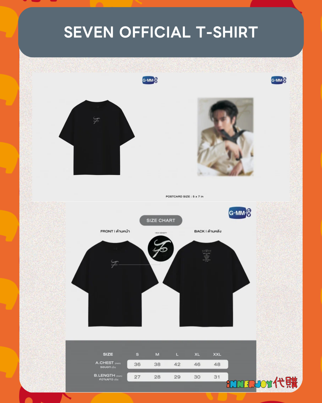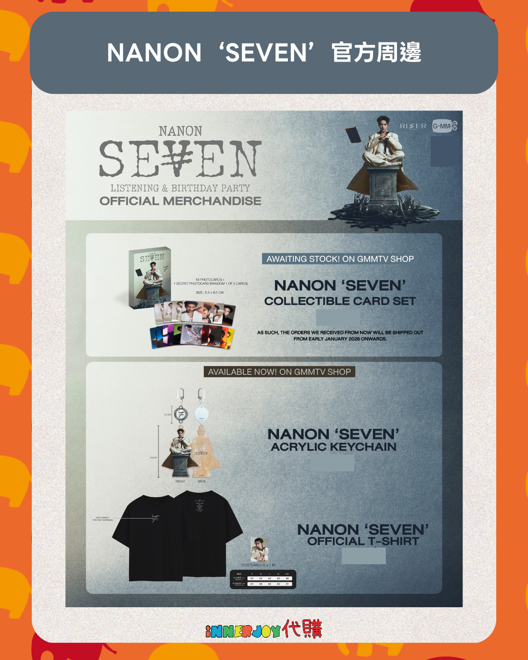 泰國現貨及預購 | Nanon - NANON ‘SEVEN’ OFFICIAL MERCHANDISE 官方周邊 【預購-1月中到貨】 SEVEN COLLECTIBLE CARD SET 收藏相卡套裝 【現貨商品-下單後7-14天到貨】 SEVEN ACRYLIC KEYCHAIN SEVEN OFFICIAL T-SHIRT 尺碼 Size S Chest 胸寬 36" / Length 衣長 27" Size M Chest 胸寬 38" / Length 衣長 28" Size L Chest 胸寬 42" / Length 衣長 29" Size XL Chest 胸寬 46" / Length 衣長 30" Size XXL Chest 胸寬 48" / Length 衣長 31" 📌 International Customers Notice: If you are unsure about any product details, please contact us before placing your order. We’re happy to assist you! 🔸🔸🔸 Deadline|截止 : Until Out of Stock 售完即止 Earliest Delivery 預計最早發貨:到貨後7 - 14日 🔸🔸🔸 書刊購買須知: ⭐運送過程中雜誌可能會有不可避免的磕碰折角,出版商可不作售後更換,如介意請慎買。 ⭐出版商可能隨時改動書本設計和內容, InnerjoyThailand不作另行通知 ⭐內地雜誌出現需要售後的情況較多和部分銷售方有機會不提供售後或走數,請細閱網站內代購條款之圖片,下單即視為同意和知悉相關情況。 ⚠️備註:裝置屏幕顯示與拍攝時的顏色可能有差異,實際產品和參考圖片可能略有不同,望知悉。 🔸🔸🔸 ✨The product content is for reference only, and subject to the actual official sales situation. 📍商品內容僅供參考,一切以官方銷售實際情況作準。 ✨代購價格已包含泰國-香港路段國際郵費,香港本地可順豐到付,或到葵廣/旺角中心格仔鋪領取 ✨信用卡/八達通/ AlipayHK/WechatPay/Tap&Go/PayMe/ApplePay/GooglePay/Paypal/FPS/銀行轉帳✨ 🟠🟠🟠 Disclaimer: If the posting content infringes or violates your copyrights, please contact us immediately. 本公司並沒有持有任何品牌之版權,所有商標及版權均屬該品牌持有人,圖片及資料轉載只作分享用途,敬請留意。