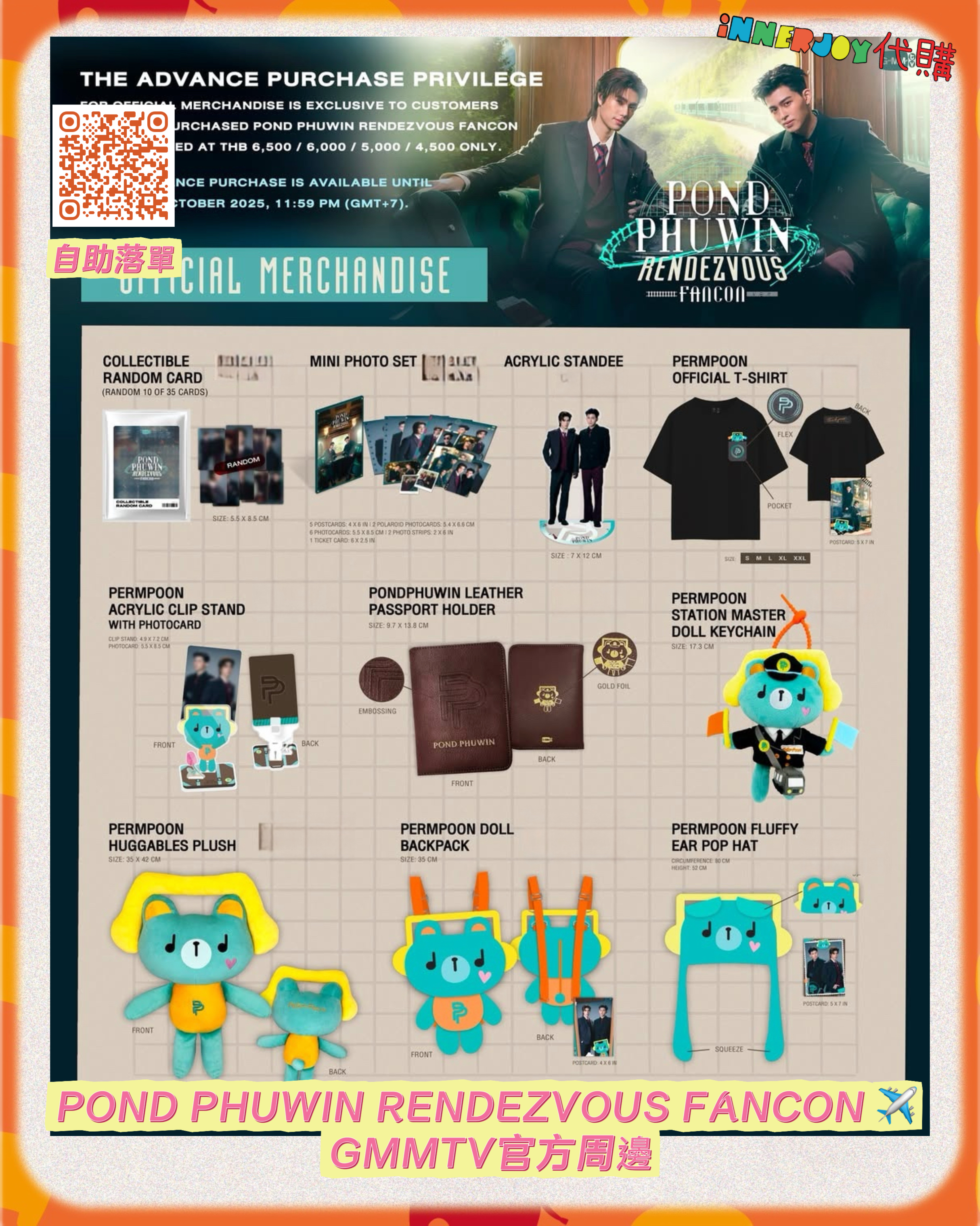 泰國現貨及預購 | PondPhuwin - POND PHUWIN RENDEZVOUS FANCON ✈️ GMMTV官方周邊 【✨如未能成功代購,將於通知後安排七天內退款✨】 【📝限量產品將按訂單次序派貨】 【商品選擇:9款】 ✈️ Mini Photo Set 迷你相片套裝 ✈️ Acrylic Standee 亞加力立牌 ✈️ Permpoon Station Master Doll Keychain 公仔鎖匙扣 📍預購產品 ✈️ PondPhuwin Leather Passport Holder 護照保護套 📍少量 ✈️ Permpoon Acrylic Clip Stand with Photocard 亞加力夾夾支架 ✈️ Permpoon Huggables Plush 可愛抱抱公仔 📍少量 ✈️ Permpoon Doll Backpack Permpoon公仔小背囊 ✈️ Permpoon Fluffy Ear Pop Hat 立耳造型帽帽 ✈️ Officail Tee :S - XXL Officail Tee Size Details: S (Chest: 36 inches / Length: 27 inches) M (Chest: 38 inches / Length: 28 inches) L (Chest: 42 inches / Length: 29 inches) XL (Chest: 46 inches / Length: 30 inches) XXL (Chest: 48 inches / Length: 31 inches) 📌 International Customers Notice: If you are unsure about any product details, please contact us before placing your order. We’re happy to assist you! 📍書刊注意:產品可能會因運送過程有不可避免的磕碰或折角,如介意請慎買。📍 📍最終解釋權均歸官方所有📍 ⚠️備註:裝置屏幕顯示與拍攝時的顏色可能有差異,實際產品和參考圖片可能略有不同,望知悉。 ✨由於匯率浮動,價格有機會有所更改,敬請注意 🔸🔸🔸 In Stock Deadline|現貨截止 : Until the stock out 售完即止 Earliest Delivery 預計最早發貨:落單後 21-30日,視乎GMM發貨速度;官方如有延遲,如有更改將於限時動態(Story)內公佈。 Preorder Deadline|預購截止 : 22/11/2025 18:00 Earliest Delivery 預計最早發貨:Early FEB 2026 2月初,GMM發貨需時1個月;官方如有延遲,如有更改將於限時動態(Story)內公佈。 🔸🔸🔸 ✨The product content is for reference only, and subject to the actual official sales situation. 📍商品內容僅供參考,一切以官方銷售實際情況作準。 ✨代購價格已包含泰國-香港路段國際郵費,香港本地可順豐到付,或到葵廣/旺角中心格仔鋪領取 ✨信用卡/八達通/ AlipayHK/WechatPay/Tap&Go/PayMe/ApplePay/GooglePay/Paypal/FPS/銀行轉帳✨ 🟠🟠🟠 Disclaimer: If the posting content infringes or violates your copyrights, please contact us immediately. 本公司並沒有持有任何品牌之版權,所有商標及版權均屬該品牌持有人,圖片及資料轉載只作分享用途,敬請留意。