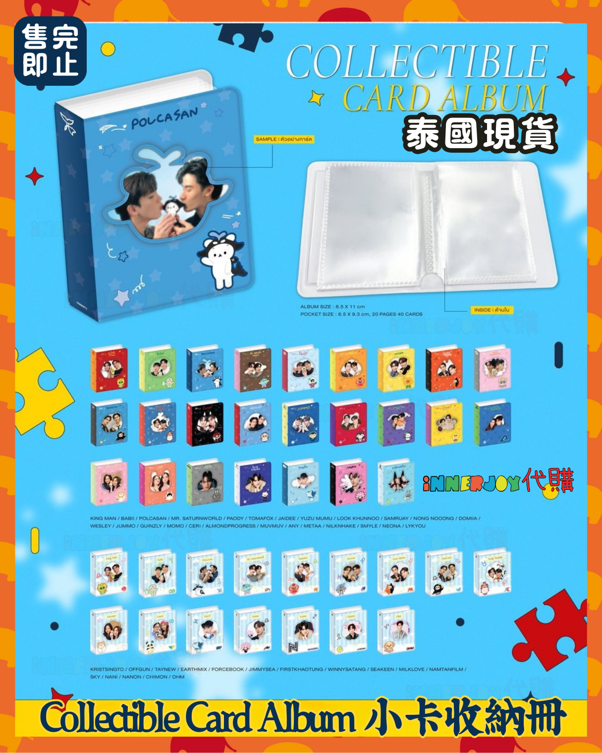 GMMTV代購 - Collectible Card Album - Official Merchandise 官方週邊 ⚠️⚠️泰國現貨售完即止,隨時下架 【商品選擇:2款】 1️⃣ Character Collectible Card Album: 25 款 Styles (售罄 SOLD OUT:JimmySea, PerthSanta, NamtanFilm) 2️⃣ Collectible Card Album : 16 款 Styles 📌 International Customers Notice: If you are unsure about any product details, please contact us before placing your order. We’re happy to assist you! 📍最終解釋權均歸官方所有📍 ⚠️備註:裝置屏幕顯示與拍攝時的顏色可能有差異,實際產品和參考圖片可能略有不同,望知悉。 ✨由於匯率浮動,價格有機會有所更改,敬請注意 🔸🔸🔸 Deadline|截止 : 泰國現貨有限,售完即止,隨時下架 Earliest Delivery 預計最早發貨:視乎GMM發貨速度,21-30天到貨;官方如有延遲,如有更改將於限時動態(Story)內公佈。 🔸🔸🔸 書刊購買須知: ⭐運送過程中雜誌可能會有不可避免的磕碰折角,出版商可不作售後更換,如介意請慎買。 ⭐出版商可能隨時改動書本設計和內容, InnerjoyThailand不作另行通知 ⭐內地雜誌出現需要售後的情況較多和部分銷售方有機會不提供售後或走數,請細閱網站內代購條款之圖片,下單即視為同意和知悉相關情況。 ⚠️備註:裝置屏幕顯示與拍攝時的顏色可能有差異,實際產品和參考圖片可能略有不同,望知悉。 🔸🔸🔸 ✨The product content is for reference only, and subject to the actual official sales situation. 📍商品內容僅供參考,一切以官方銷售實際情況作準。 ✨代購價格已包含泰國-香港路段國際郵費,香港本地可順豐到付,或到葵廣/旺角中心格仔鋪領取 ✨信用卡/八達通/ AlipayHK/WechatPay/Tap&Go/PayMe/ApplePay/GooglePay/Paypal/FPS/銀行轉帳✨ 🟠🟠🟠 Disclaimer: If the posting content infringes or violates your copyrights, please contact us immediately. 本公司並沒有持有任何品牌之版權,所有商標及版權均屬該品牌持有人,圖片及資料轉載只作分享用途,敬請留意。