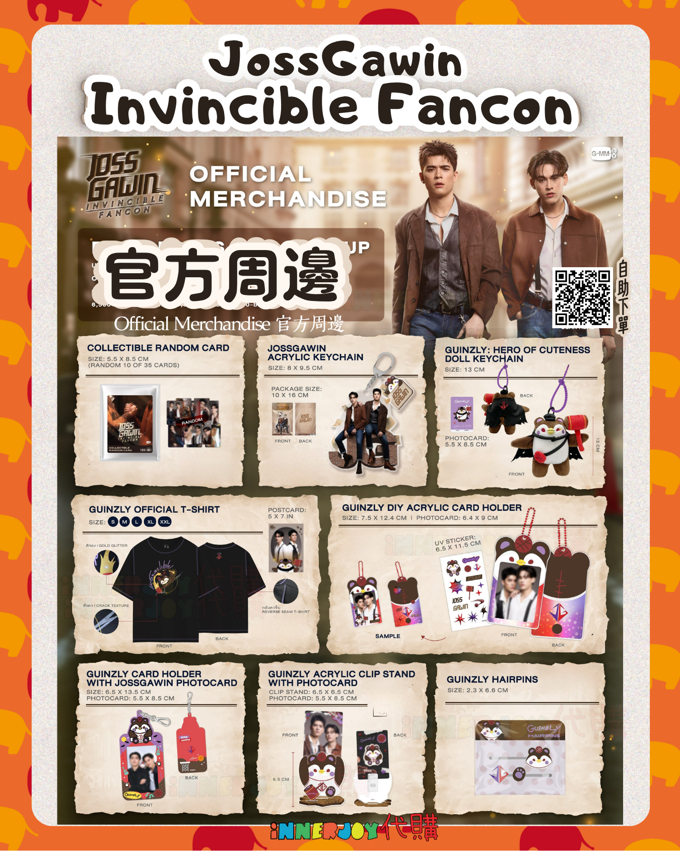 GMM代購 泰國現貨 | JossGawin 演唱會 - INVINCIBLE FANCON Official Merchandise 官方周邊 【商品選擇:8款】 🤎 Collectible Random Card 隨機小卡 (Random 10 of 38 Cards) 🤎 JossGawin Acrylic Keychain 亞克力鑰匙圈 🤎 Guinzly: Hero Of Cuteness Doll Keychain Quinzly二代鎖匙扣 🤎 GuinzlyDIY Acrylic Card Holder DIY亞加力卡套 🤎 Guinzly Card Holder With JossGawin Photocard 公仔卡套 🤎 Guinzly Acrylic Clip Stand With Photocard 亞加力夾夾立牌 🤎 Guinzly Hairpins 髮夾 🤎 GuinzlyOfficial T-shirt 官方T恤 : S-2XL 🟠 因按訂單採購,下單後不設任何換貨/退貨/退款,請謹慎下單。 📍下單前務必仔細閱讀商品之全部詳情 📍Product Details refer to the official announcement and images. 📍最終解釋權均歸官方所有📍 ⚠️ 備註:裝置屏幕顯示與拍攝時的顏色可能有差異,實際產品和參考圖片可能略有不同,望知悉。 🔸🔸🔸 Deadline|截止 : 售完即止,同步下架。建議先DM後下單,現貨有機會出現突然售罄的情況。 Earliest Delivery 預計最早發貨:14-30天發貨時間,最終視乎GMM速度 🔸🔸🔸 書刊購買須知: ⭐運送過程中雜誌可能會有不可避免的磕碰折角,出版商可不作售後更換,如介意請慎買。 ⭐出版商可能隨時改動書本設計和內容, InnerjoyThailand不作另行通知 ⭐內地雜誌出現需要售後的情況較多和部分銷售方有機會不提供售後或走數,請細閱網站內代購條款之圖片,下單即視為同意和知悉相關情況。 ⚠️備註:裝置屏幕顯示與拍攝時的顏色可能有差異,實際產品和參考圖片可能略有不同,望知悉。 🔸🔸🔸 ✨The product content is for reference only, and subject to the actual official sales situation. 📍商品內容僅供參考,一切以官方銷售實際情況作準。 ✨代購價格已包含泰國-香港路段國際郵費,香港本地可順豐到付,或到葵廣/旺角中心格仔鋪領取 ✨信用卡/八達通/ AlipayHK/WechatPay/Tap&Go/PayMe/ApplePay/GooglePay/Paypal/FPS/銀行轉帳✨ 🟠🟠🟠 Disclaimer: If the posting content infringes or violates your copyrights, please contact us immediately. 本公司並沒有持有任何品牌之版權,所有商標及版權均屬該品牌持有人,圖片及資料轉載只作分享用途,敬請留意。