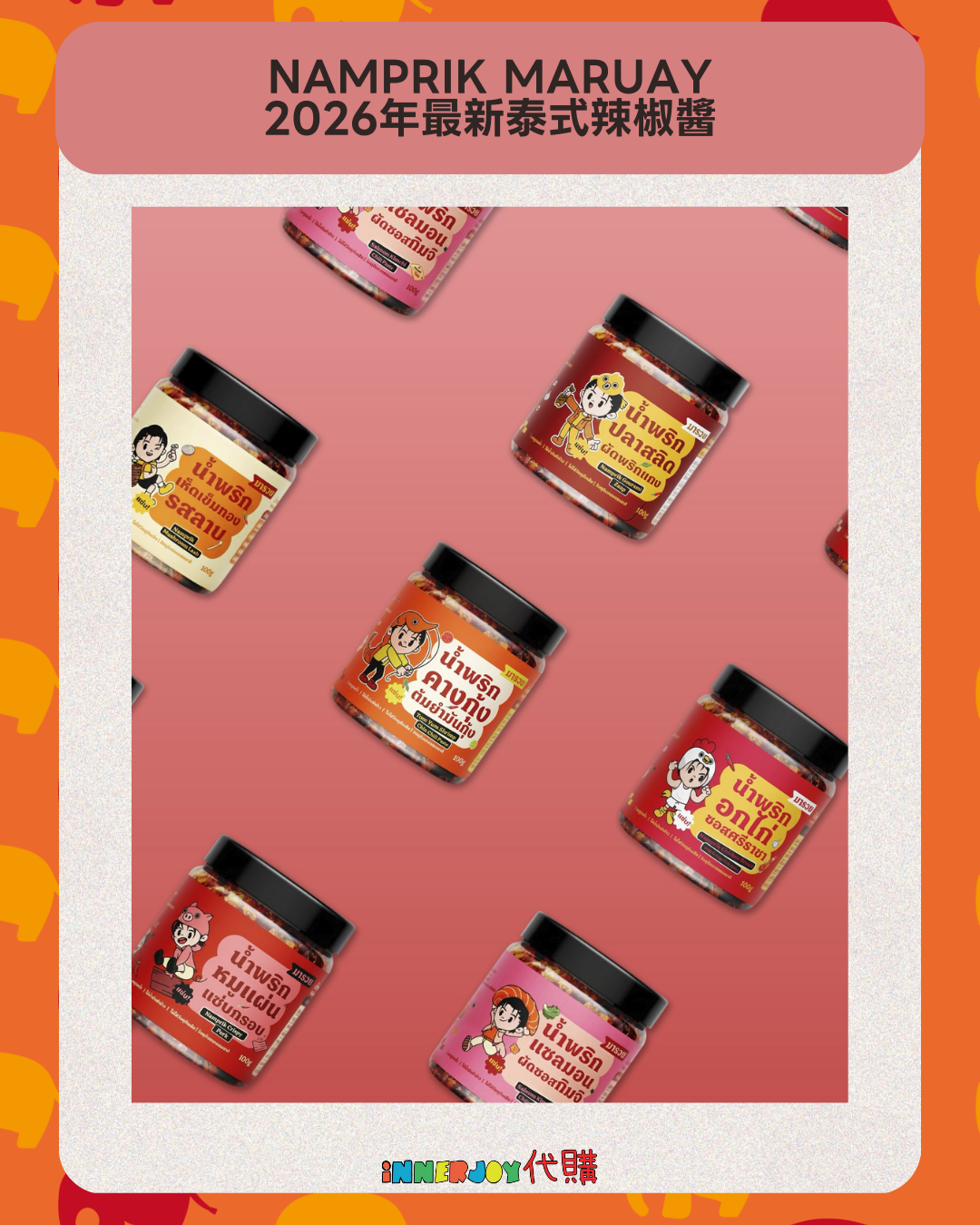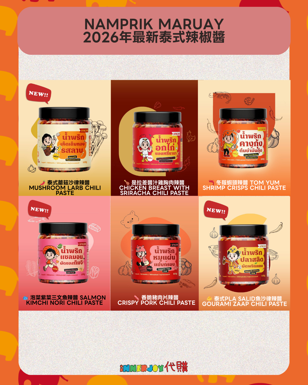 泰國現貨 | BossNoeul - Boss個人品牌 Namprik Maruay 2026年最新泰式辣椒醬 ⚠️限香港地區下單⚠️ 【商品內容】 🌶️ 泰式蘑菇沙律辣醬 Mushroom Larb Chili Paste 🍗 是拉差醬汁雞胸肉辣醬 Chicken Breast with Sriracha Chili Paste 🦐 冬蔭蝦頭辣醬 Tom Yum Shrimp Crisps Chili Paste 🐟 泡菜紫菜三文魚辣醬 Salmon Kimchi Nori Chili Paste 🥓 香脆豬肉片辣醬 Crispy Pork Chili Paste 🐠 泰式Pla Salid魚沙律辣醬 Gourami Zaap Chili Paste ⚠️ 本產品含有甲殼類、堅果類、麩質穀物、小麥粉、大豆、奶類,不適合對其過敏體質者食用 ,敬請留意 ⚠️ 🥡 保存條件 (Storage Condition) 保存期限:未開封或存放於密封容器中存於冰箱內,最長可保存 1 個月,請參考包裝上列明日期 注意事項:避免陽光直射,請置於陰涼乾燥處或冰箱內 🔸🔸🔸 Deadline|截止 : Until Out of Stock Earliest Delivery 預計發貨:敬請確保長時間能夠在港收貨,如未能確保請勿下單 🔸🔸🔸 ✨The product content is for reference only, and subject to the actual official sales situation. 商品內容僅供參考,一切以官方銷售實際情況作準。✨ ✨代購價格已包含泰國-香港國際郵費,本地郵費到付 ✨接納各平台電子付款 🔸🔸🔸 ⚠️溫馨提示⚠️ 由於匯率浮動,價格有機會有所更改,敬請注意 購買前請閱讀網站置頂之「退貨及退款政策」 客人提交訂單後,視為知悉海關抽查之可能情況並同意政策。 海關抽查檢驗時,包裝會因海關打開而有機會出現破損,本店不會為海關檢查造成的各種情況與問題負責,敬請諒解。 預售產品及代購訂單不接受任何因素退款或退貨,為保障雙方,開箱前可全程開始拍影片檢視貨品狀況。 食物產品由於衛生問題,開封後不接受任何退換或退款。 Disclaimer: If the posting content infringes or violates your copyrights, please contact us immediately. 本公司並沒有持有任何品牌之版權,所有商標及版權均屬該品牌持有人,圖片及資料轉載只作分享用途,敬請留意。