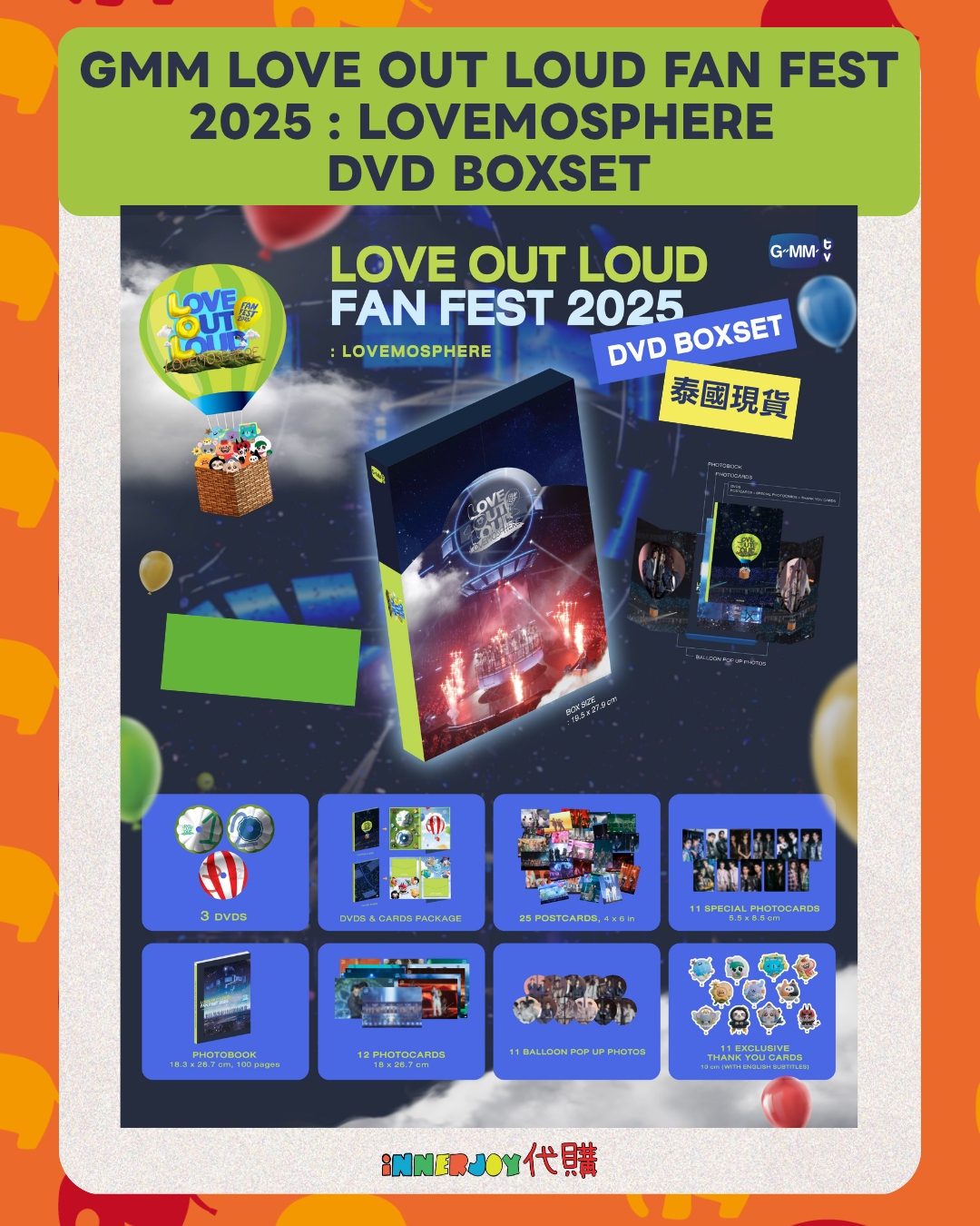 泰國現貨 (下單後14-30天到港) | GMM LOVE OUT LOUD FAN FEST 2025 : LOVEMOSPHERE🎈DVD BOXSET GMMTV官方周邊 與22位炙手可熱的冒險家一起翱翔於自由的國度。 還與特別嘉賓:包括來自JASP.ER的Aou,以及來自LYKN的Lego、Nut、Hong和Tui傾盡全力,為觀眾帶來扣人心弦的表演。 讓您沉浸充滿喜悅、感動和滿足的刺激之旅。 這套珍貴的DVD Boxset它捕捉了台前幕後每個難忘瞬間——包括兩場現場演出的精彩場景、特別曲目和完整歌單。此外,還有獨家的周邊送給珍貴的fans們。 【商品內容】 ✨外盒 Box*1:(19.5 x 27.9 cm) 內側兩側均設計有彈出式氣球,打開後可看到藝人們的相片。 ✨DVD*3 :包含特別幕後花絮以及2天2場的精彩表演 ✨寫真集 Photobook*1:100 頁(18.3 x 26.7cm) ✨相卡 Photocards*12,附藝人們的印刷簽名(18.3 x 26.7cm) ✨明信片 Postcards*25:(4 x 6 inch) ✨獨家相卡Special Photocards *11(5.5 x 8.5 cm) ✨ 獨家感謝卡 Exclusive Thank You Cards*11:📍獨家重印📍 🔸🔸🔸 Deadline|截止 : Until Out of Stock Earliest Delivery 預計最早發貨:下單後14-30日 🔸🔸🔸 ✨The product content is for reference only, and subject to the actual official sales situation. 商品內容僅供參考,一切以官方銷售實際情況作準。✨ ✨代購價格已包含日本-香港路段國際郵費,香港本地可順豐到付,或到觀塘店/葵廣格仔鋪領取 ✨信用卡/八達通/AlipayHK/WechatPay/Tap&Go/PayMe/FPS/銀行轉帳✨ 🟠🟠🟠 ⚠️代購溫馨提示⚠️ 由於匯率浮動,價格有機會有所更改,敬請注意 購買前請閱讀網站置頂之「退貨及退款政策」 客人提交訂單後,視為知悉海關抽查之可能情況並同意政策。 海關抽查檢驗時,包裝會因海關打開而有機會出現破損,本店不會為海關檢查造成的各種情況與問題負責,敬請諒解。 預售產品及代購訂單不接受任何因素退款或退貨,為保障雙方,開箱前可全程開始拍影片檢視貨品狀況。 美妝/保養產品由於衛生問題,開封後不接受任何退換或退款。 Disclaimer: If the posting content infringes or violates your copyrights, please contact us immediately. 本公司並沒有持有任何品牌之版權,所有商標及版權均屬該品牌持有人,圖片及資料轉載只作分享用途,敬請留意。