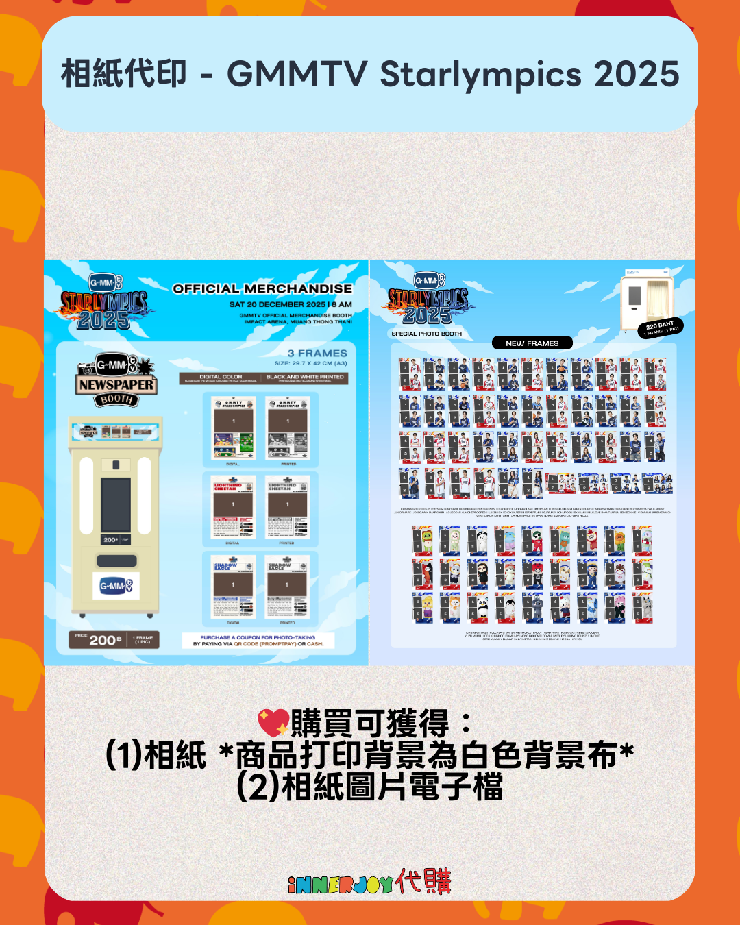 現場代印 | GMM官方周邊 相紙代印 - GMMTV Starlympics 2025 請注意:閣下一旦成功提交訂單,即表示了解並同意是次訂購之運送安排、付款須知及條款細則。請確保訂購數量及選項資料完全正確;訂單一經提交後不能取消,並不設任何退款及更改。 【✨現場代購商品注意事項:由於現場代購需要承擔來回會場的交通費用、排隊輪候購買商品的時間成本,以及目前大部分店家設有限購規則等因素,代購價格會相對高於預購。顧客在考慮下單前,建議先衡量是否可以等待預購,以獲得更優惠的價格。】 【商品內容】 💖購買可獲得: (1)相紙 *商品打印背景為白色背景布* (2)相紙圖片電子檔 💖 四件起,每件HKD 80 ,搵朋友仔一齊買啦🥰 📌 International Customers Notice: If you are unsure about any product details, please contact us before placing your order. We’re happy to assist you! 🔸🔸🔸 Deadline|截止 : 19/12/2025 18:00 Earliest Delivery 預計最早發貨:Mid Jan 1月中旬 🔸🔸🔸 書刊購買須知: ⭐運送過程中雜誌可能會有不可避免的磕碰折角,出版商可不作售後更換,如介意請慎買。 ⭐出版商可能隨時改動書本設計和內容, InnerjoyThailand不作另行通知 ⭐內地雜誌出現需要售後的情況較多和部分銷售方有機會不提供售後或走數,請細閱網站內代購條款之圖片,下單即視為同意和知悉相關情況。 ⚠️備註:裝置屏幕顯示與拍攝時的顏色可能有差異,實際產品和參考圖片可能略有不同,望知悉。 🔸🔸🔸 ✨The product content is for reference only, and subject to the actual official sales situation. 📍商品內容僅供參考,一切以官方銷售實際情況作準。 ✨代購價格已包含泰國-香港路段國際郵費,香港本地可順豐到付,或到葵廣/旺角中心格仔鋪領取 ✨信用卡/八達通/ AlipayHK/WechatPay/Tap&Go/PayMe/ApplePay/GooglePay/Paypal/FPS/銀行轉帳✨ 🟠🟠🟠 Disclaimer: If the posting content infringes or violates your copyrights, please contact us immediately. 本公司並沒有持有任何品牌之版權,所有商標及版權均屬該品牌持有人,圖片及資料轉載只作分享用途,敬請留意。