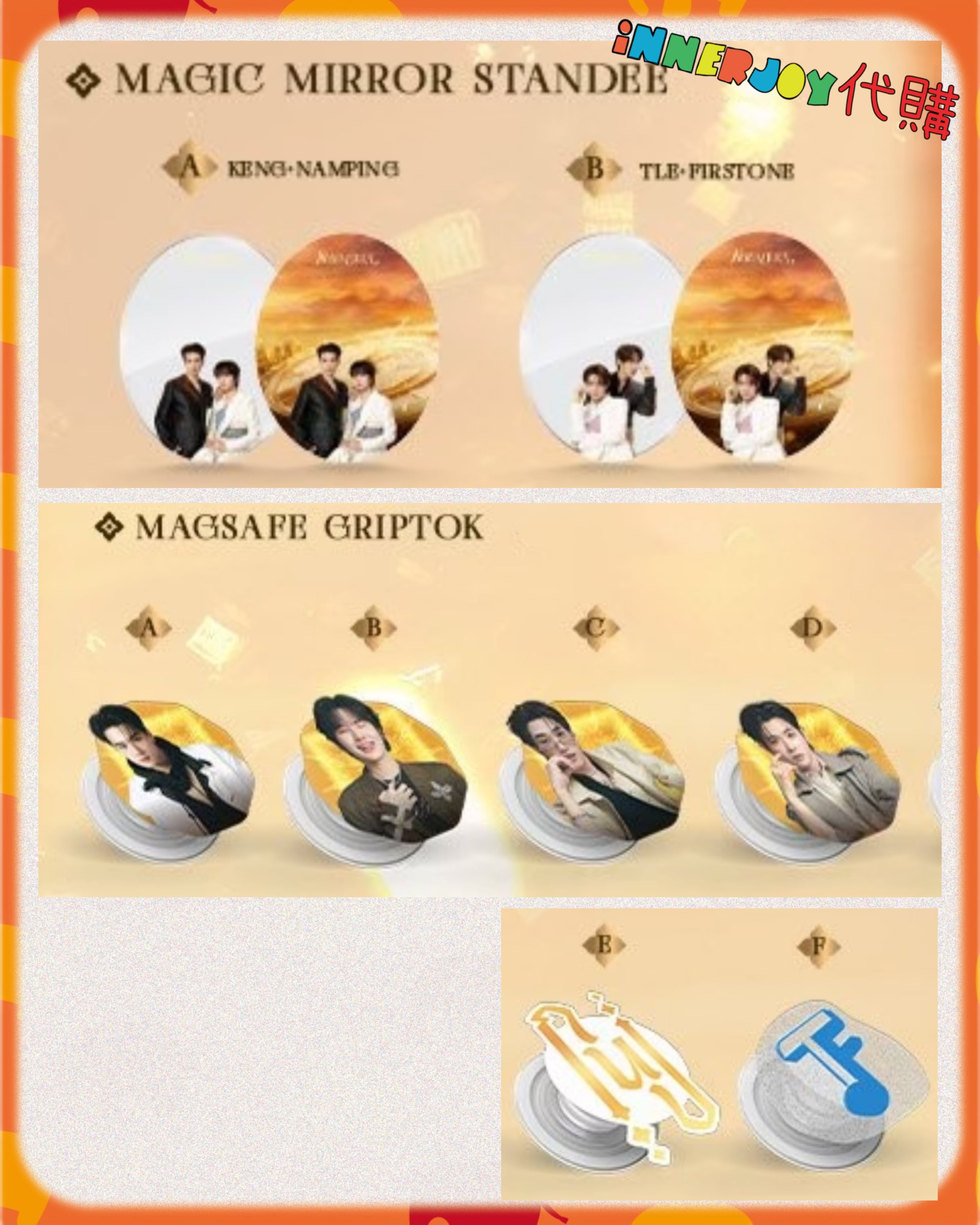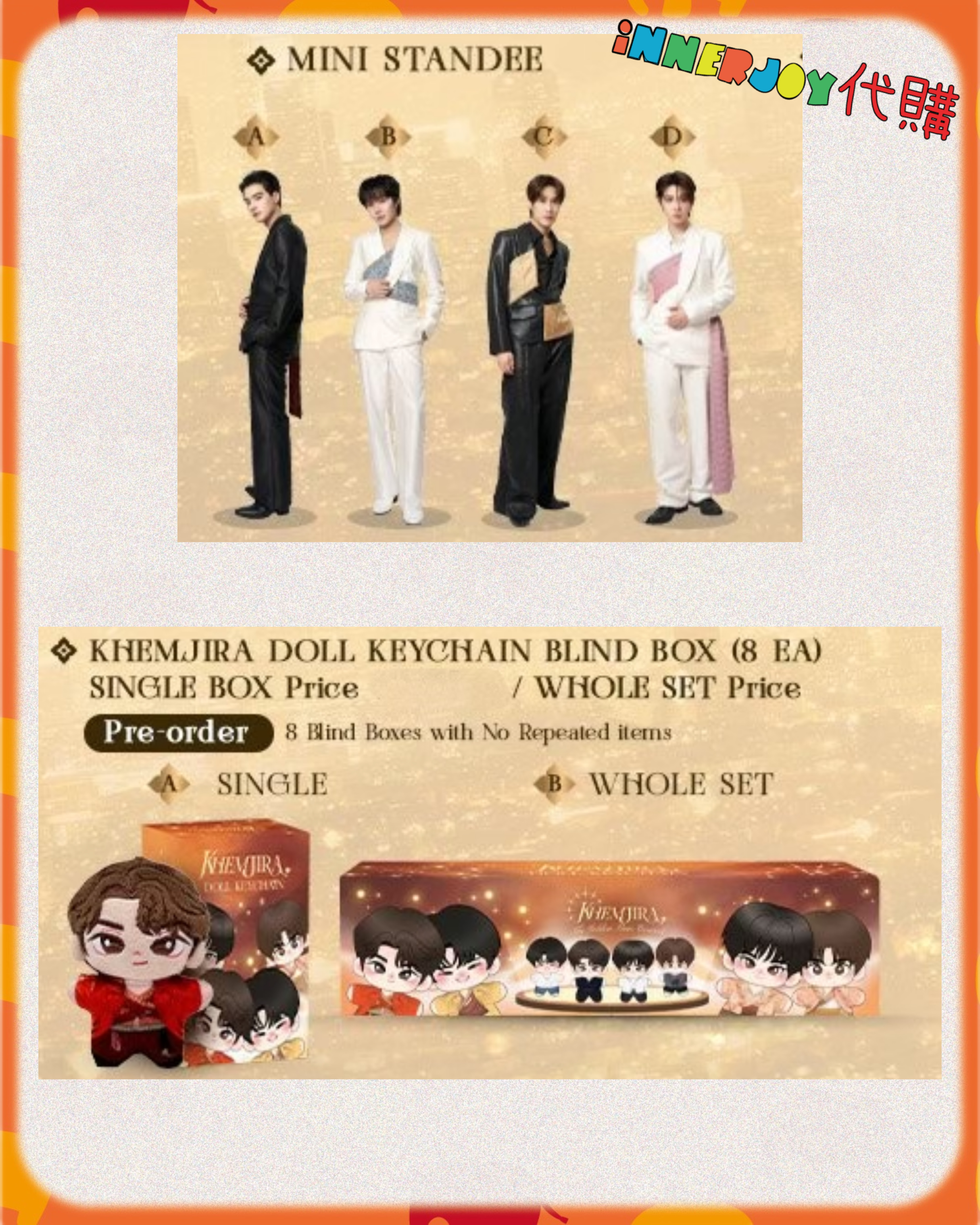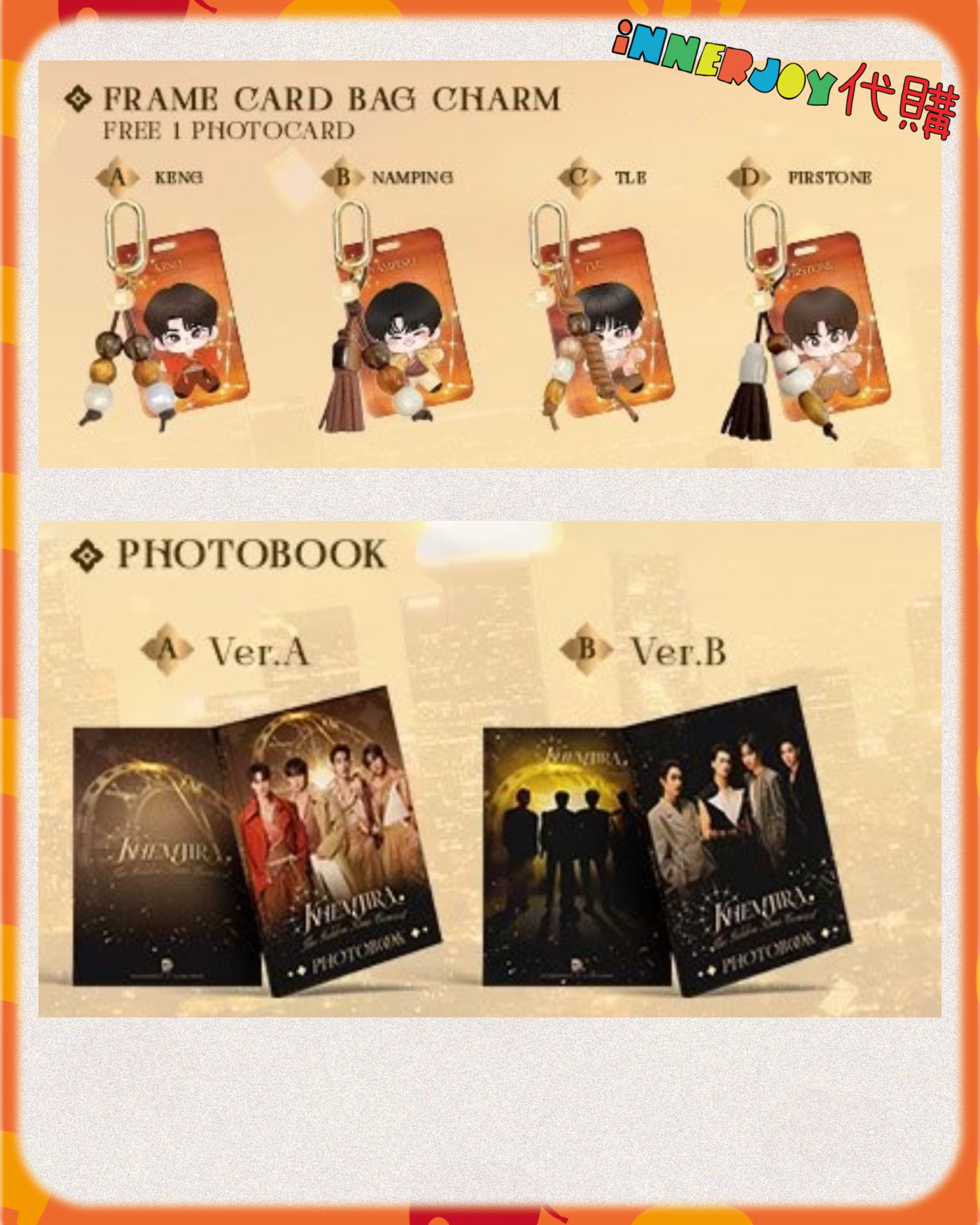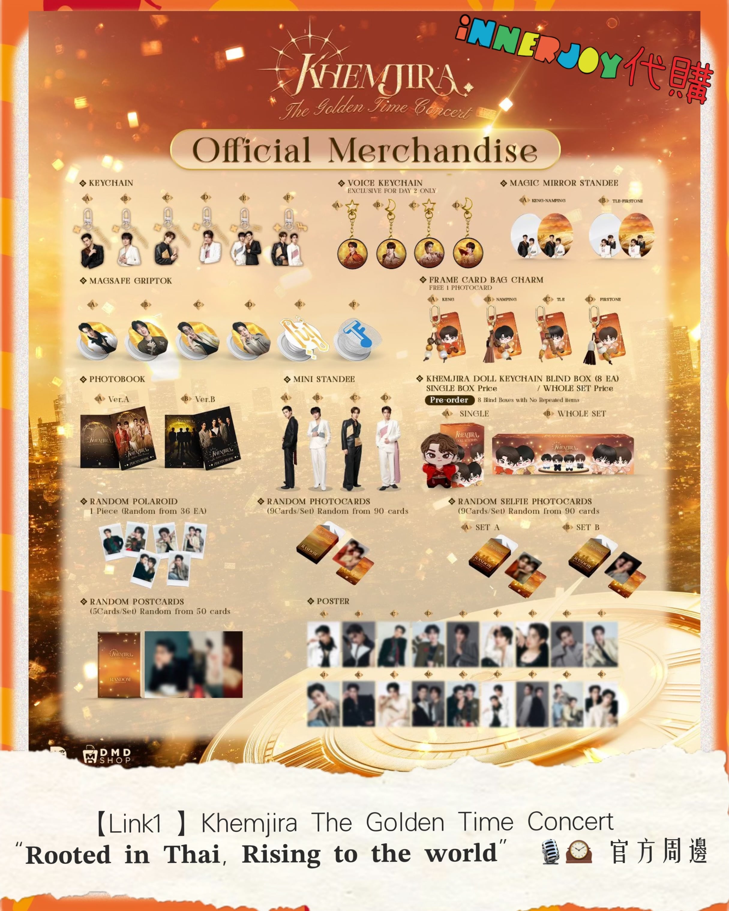 現場代購 | 【Link1】KengNamping TleFirstone - Khemjira The Golden Time Concert “𝐑𝐨𝐨𝐭𝐞𝐝 𝐢𝐧 𝐓𝐡𝐚𝐢, 𝐑𝐢𝐬𝐢𝐧𝐠 𝐭𝐨 𝐭𝐡𝐞 𝐰𝐨𝐫𝐥𝐝” 🎙🕰 官方周邊 【✨搶購商品如未能成功搶購將默認改為預購✨】 【商品內容】 1)Keychain:A - F 2) Voice Keychain:A - D 3)Magic Mirror Standee:A/B 4)Magsafe Girptok:A - F 5)Frame Card Bag Charm : A - D 6) Photobook : A / B 7) Mini Standee : A /B 8) Khemjira Doll Keychain Blind Box ,共8款📍Preorder:2月下旬開始發貨 - Sinlge Box 單盒/Whole Box 全盒 9)Random Polaroid 1張,共36款 10)Random Photocard 9 張,共 90款 11)Random Selfie Photocard 9 張,共 90款:A / B 12)Random Postcard 5張,共50款 13)Poster:A - R 📌 International Customers Notice: If you are unsure about any product details, please contact us before placing your order. We’re happy to assist you! 📍最終解釋權均歸官方所有📍 ⚠️備註:裝置屏幕顯示與拍攝時的顏色可能有差異,實際產品和參考圖片可能略有不同,望知悉。 ✨由於匯率浮動,價格有機會有所更改,敬請注意 🔸🔸🔸 Deadline|截止 : 16/01/2026 18:00 Earliest Delivery 預計最早發貨:演唱會完結後 7 -14日到港;官方如有延遲,如有更改將於限時動態(Story)內公佈。 🔸🔸🔸 書刊購買須知: ⭐運送過程中雜誌可能會有不可避免的磕碰折角,出版商可不作售後更換,如介意請慎買。 ⭐出版商可能隨時改動書本設計和內容, InnerjoyThailand不作另行通知 ⭐內地雜誌出現需要售後的情況較多和部分銷售方有機會不提供售後或走數,請細閱網站內代購條款之圖片,下單即視為同意和知悉相關情況。 ⚠️備註:裝置屏幕顯示與拍攝時的顏色可能有差異,實際產品和參考圖片可能略有不同,望知悉。 🔸🔸🔸 ✨The product content is for reference only, and subject to the actual official sales situation. 📍商品內容僅供參考,一切以官方銷售實際情況作準。 ✨代購價格已包含泰國-香港路段國際郵費,香港本地可順豐到付,或到葵廣/旺角中心格仔鋪領取 ✨信用卡/八達通/ AlipayHK/WechatPay/Tap&Go/PayMe/ApplePay/GooglePay/Paypal/FPS/銀行轉帳✨ 🟠🟠🟠 Disclaimer: If the posting content infringes or violates your copyrights, please contact us immediately. 本公司並沒有持有任何品牌之版權,所有商標及版權均屬該品牌持有人,圖片及資料轉載只作分享用途,敬請留意。