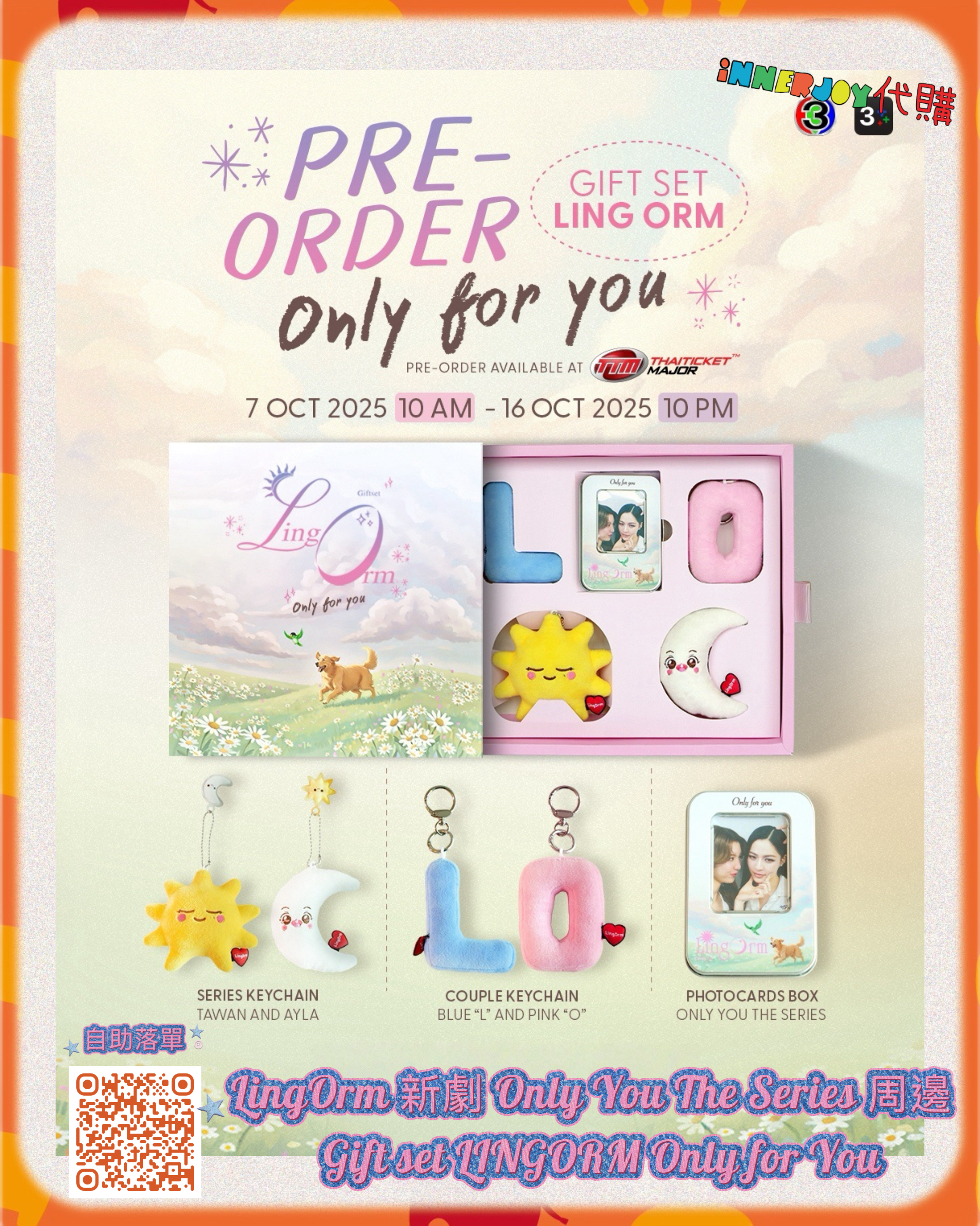 第一團預購 | LingOrm - 新劇 Only You The Series 周邊 Gift set LINGORM Only for You【首團 06/10 截單】 【 商品內容:】 🌙 Tawan and Ayla Doll Keychain 🌙 Blue "L" and Pink "O" Couple Keychian 🌙 Photocard Box 🟠 因按訂單採購,下單後不支持任何退貨/退款,請謹慎下單。 【✨如遇官方滿額截單,將於通知後7個工作天安排退款✨】 📍 最終解釋權均歸官方所有📍 ⚠️ 備註:裝置屏幕顯示與拍攝時的顏色可能有差異,實際產品和參考圖片可能略有不同,望知悉。 🔸🔸🔸 【匯率浮動,敬請注意】 Deadline|截止 : 首團 06/10/2025 18:00 截單,第二團 15/10/2025 18:00 Earliest Delivery 預計最早發貨:TBC,或有延遲,如有更改將於限時動態(Story)內公佈 ■ 歡迎團購/合單|Group order is available. DM for details 凡購買 10 件以上,可領取團購優惠,歡迎粉絲們和各大Fansclub查詢 🔸🔸🔸 ✨The product content is for reference only, and subject to the actual official sales situation. 商品內容僅供參考,一切以官方銷售實際情況作準。✨ ✨代購價格已包含泰國-香港路段國際郵費,香港本地可順豐到付,或到葵廣/旺角中心格仔鋪領取 ✨信用卡/八達通/AlipayHK/WechatPay/Tap&Go/PayMe/FPS/銀行轉帳✨ 🟠🟠🟠 📍書刊購買須知: ⭐運送過程中雜誌可能會有不可避免的磕碰折角,出版商可不作售後更換,如介意請慎買。 ⭐出版商可能隨時改動書本設計和內容, InnerjoyThailand不作另行通知。 🟠🟠🟠 ⚠️代購溫馨提示⚠️ 由於匯率浮動,價格有機會有所更改,敬請注意 購買前請閱讀網站置頂之「退貨及退款政策」 客人提交訂單後,視為知悉海關抽查之可能情況並同意政策。 海關抽查檢驗時,包裝會因海關打開而有機會出現破損,本店不會為海關檢查造成的各種情況與問題負責,敬請諒解。 預售產品及代購訂單不接受任何因素退款或退貨,為保障雙方,開箱前可全程開始拍影片檢視貨品狀況。 美妝/保養產品由於衛生問題,開封後不接受任何退換或退款。 Disclaimer: If the posting content infringes or violates your copyrights, please contact us immediately. 本公司並沒有持有任何品牌之版權,所有商標及版權均屬該品牌持有人,圖片及資料轉載只作分享用途,敬請留意。