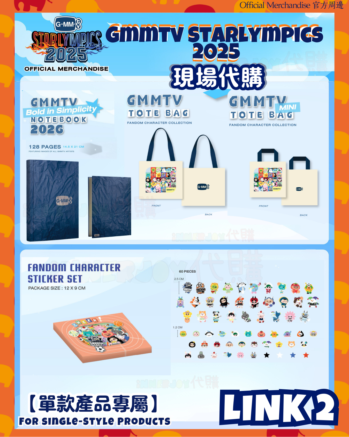 GMMTV代購 STARLYMPICS 2025 Official Merchandise 官方週邊 🔴【Link 2】單款產品專屬 - FOR Single-Style Products 【✨搶購商品如未能成功搶購將於七天內退款✨】 【✨現場代購商品注意事項:由於現場代購需要承擔來回會場的交通費用、排隊輪候購買商品的時間成本,以及目前大部分店家設有限購規則等因素,代購價格會相對高於預購。顧客在考慮下單前,建議先衡量是否可以等待預購,以獲得更優惠的價格。】 【商品內容】 1)Notebook 2026 Bold in Simplicity 2)GMMTV Tote Bag 3)GMMTV MINI Tote Bag 迷你版 4)Fandom Character Stickers Set 📌 International Customers Notice: If you are unsure about any product details, please contact us before placing your order. We’re happy to assist you! 📍最終解釋權均歸官方所有📍 ⚠️備註:裝置屏幕顯示與拍攝時的顏色可能有差異,實際產品和參考圖片可能略有不同,望知悉。 ✨由於匯率浮動,價格有機會有所更改,敬請注意 🔸🔸🔸 Deadline|截止 : 14/12/2025 18:00 Earliest Delivery 預計最早發貨:到貨後7 - 14日;官方如有延遲,如有更改將於限時動態(Story)內公佈。 🔸🔸🔸 書刊購買須知: ⭐運送過程中雜誌可能會有不可避免的磕碰折角,出版商可不作售後更換,如介意請慎買。 ⭐出版商可能隨時改動書本設計和內容, InnerjoyThailand不作另行通知 ⭐內地雜誌出現需要售後的情況較多和部分銷售方有機會不提供售後或走數,請細閱網站內代購條款之圖片,下單即視為同意和知悉相關情況。 ⚠️備註:裝置屏幕顯示與拍攝時的顏色可能有差異,實際產品和參考圖片可能略有不同,望知悉。 🔸🔸🔸 ✨The product content is for reference only, and subject to the actual official sales situation. 📍商品內容僅供參考,一切以官方銷售實際情況作準。 ✨代購價格已包含泰國-香港路段國際郵費,香港本地可順豐到付,或到葵廣/旺角中心格仔鋪領取 ✨信用卡/八達通/ AlipayHK/WechatPay/Tap&Go/PayMe/ApplePay/GooglePay/Paypal/FPS/銀行轉帳✨ 🟠🟠🟠 Disclaimer: If the posting content infringes or violates your copyrights, please contact us immediately. 本公司並沒有持有任何品牌之版權,所有商標及版權均屬該品牌持有人,圖片及資料轉載只作分享用途,敬請留意。