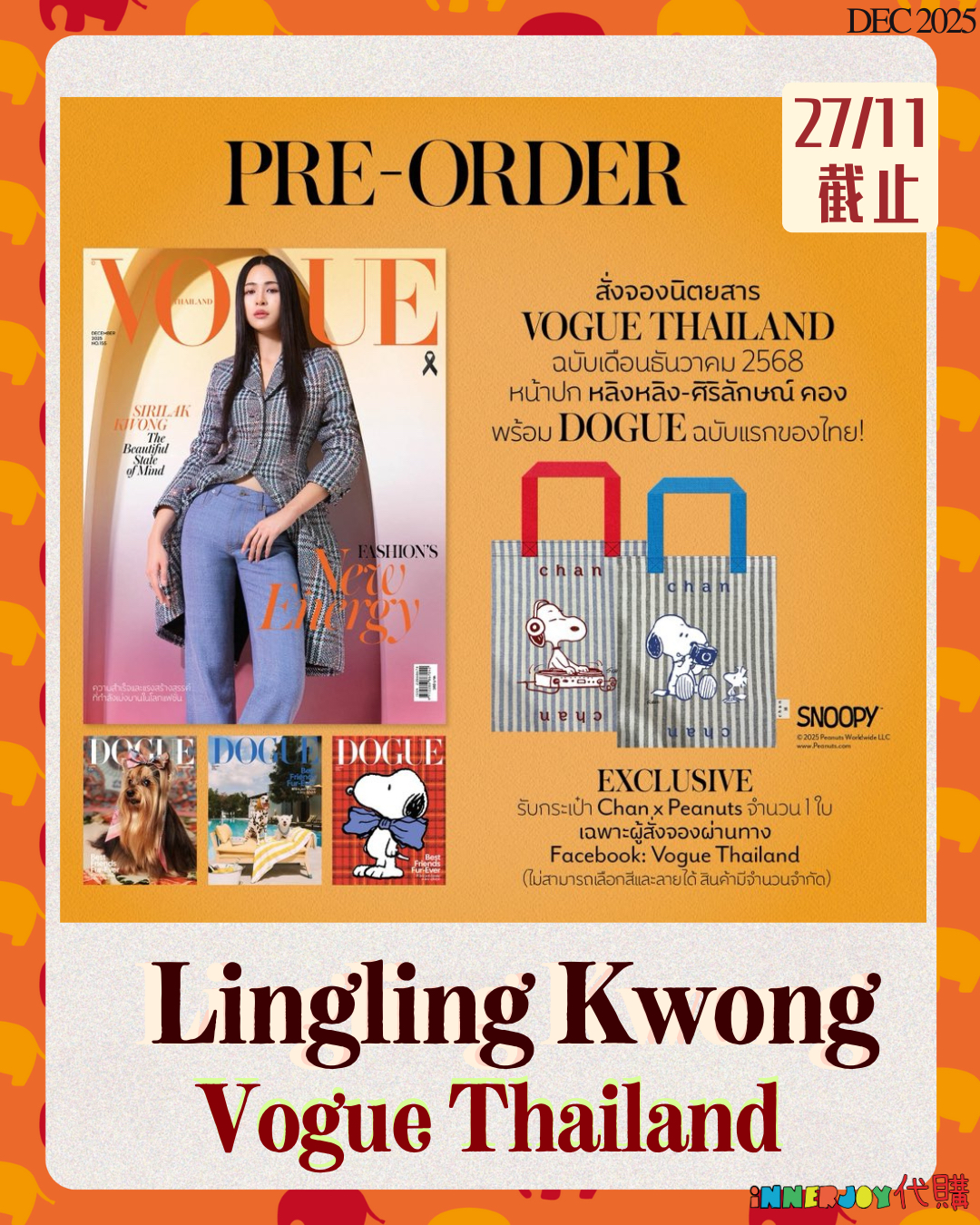 限量預購 (售完即止) | LingLingKwong x Vogue Thailand DEC 12月號封面 泰星雜誌 **由於產品較為熱門,歡迎盡快落單預購**** 🌟兩款選擇: 【已售完 sold out】❌ 雜誌連Tota Bag (Magazine + Tote Bag 隨機一款) ❌ 2️⃣ 雜誌(Only Magazine) 【✨商品如遇缺貨,將於通知後七天內退款✨】 【📝限量產品將按訂單次序派貨】 封面 Cover : LingLingKwong ======================= 代購雜誌須知: ⚠️雜誌封面材質不同,因此無法完全排除與外部環境因素接觸與摩擦,產品表面可能會因此出現細微刮痕、小點、印痕等情況,這屬於出廠、搬運、物流運輸等過程中難以避免的正常現象,並不影響商品的使用與其主要功能。因此,大部分雜誌商不願為上述之情況負責和提供售後,介意者請謹慎購買。 📍書刊注意:可能會因運送過程有不可避免的磕碰或折角,如介意請慎買。 📌 International Customers Notice: If you are unsure about any product details, please contact us before placing your order. We’re happy to assist you! 🟠 因按訂單採購,下單後不支持任何退貨/退款,請謹慎下單。 📍 最終解釋權均歸官方所有📍 ⚠️ 備註:裝置屏幕顯示與拍攝時的顏色可能有差異,實際產品和參考圖片可能略有不同,望知悉。 ✨由於匯率浮動,價格有機會有所更改,敬請注意 🔸🔸🔸 Deadline|截止 : Until the stock 售完即止 Earliest Delivery 預計最早發貨:到貨後7 - 14日 ■ 歡迎團購/合單|Group order is available. DM for details 凡購買 10 件以上,可領取團購優惠,歡迎粉絲和各大Fansclub查詢 🔸🔸🔸 書刊購買須知: ⭐運送過程中雜誌可能會有不可避免的磕碰折角,出版商可不作售後更換,如介意請慎買。 ⭐出版商可能隨時改動書本設計和內容, InnerjoyThailand不作另行通知 ⭐內地雜誌出現需要售後的情況較多和部分銷售方有機會不提供售後或走數,請細閱網站內代購條款之圖片,下單即視為同意和知悉相關情況。 ⚠️備註:裝置屏幕顯示與拍攝時的顏色可能有差異,實際產品和參考圖片可能略有不同,望知悉。 🔸🔸🔸 ✨The product content is for reference only, and subject to the actual official sales situation. 📍商品內容僅供參考,一切以官方銷售實際情況作準。 ✨代購價格已包含泰國-香港路段國際郵費,香港本地可順豐到付,或到葵廣/旺角中心格仔鋪領取 ✨信用卡/八達通/ AlipayHK/WechatPay/Tap&Go/PayMe/ApplePay/GooglePay/Paypal/FPS/銀行轉帳✨ 🟠🟠🟠 Disclaimer: If the posting content infringes or violates your copyrights, please contact us immediately. 本公司並沒有持有任何品牌之版權,所有商標及版權均屬該品牌持有人,圖片及資料轉載只作分享用途,敬請留意。