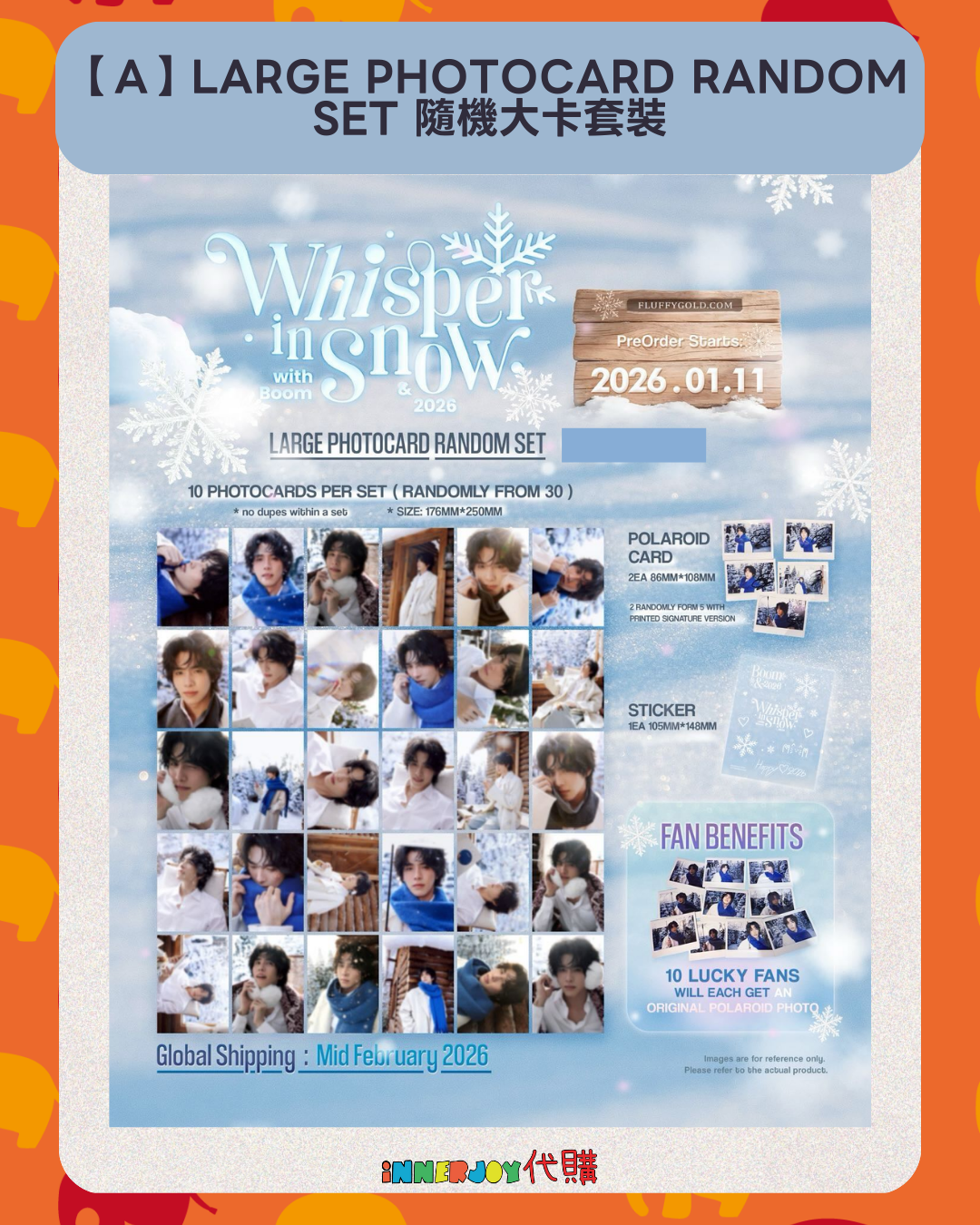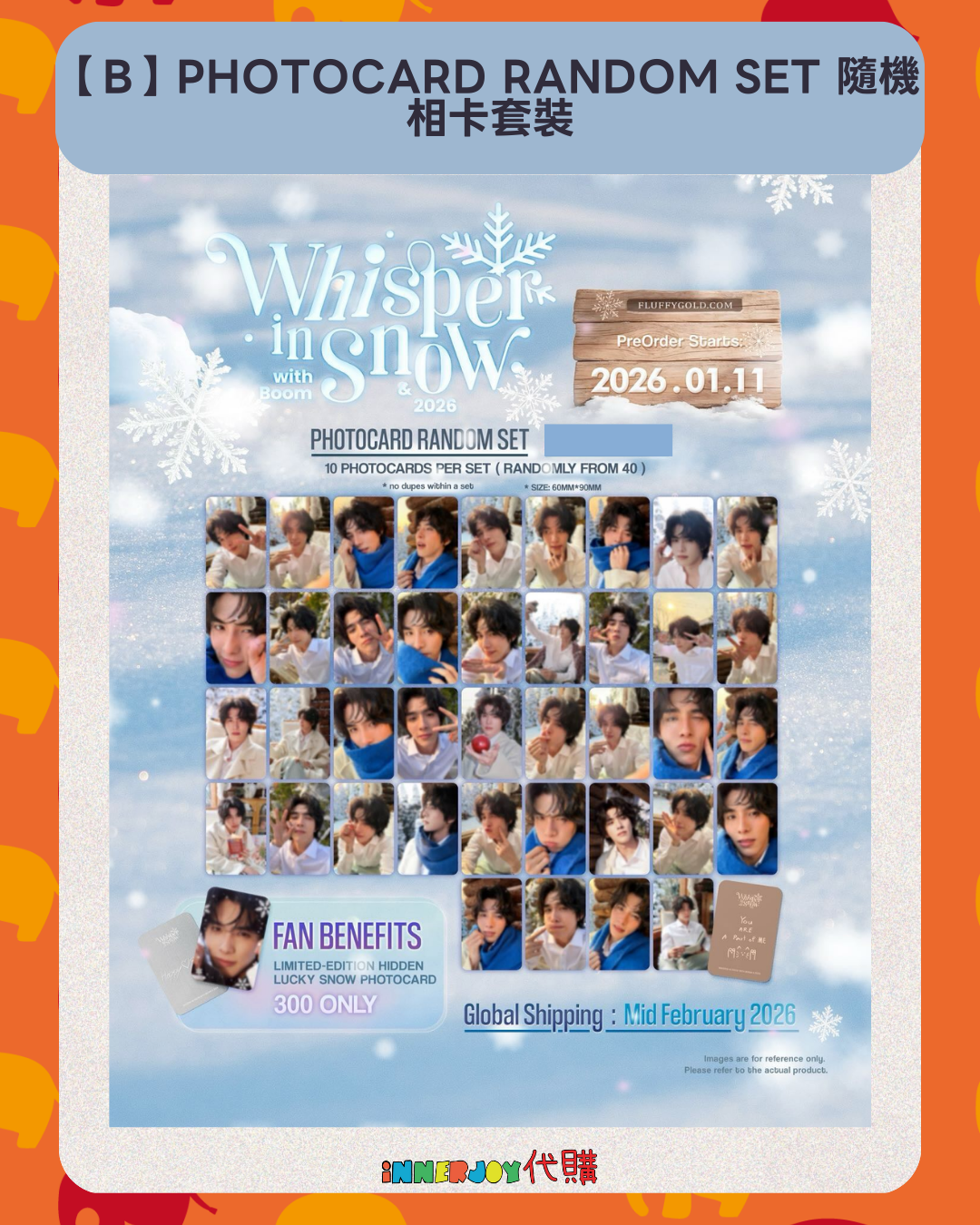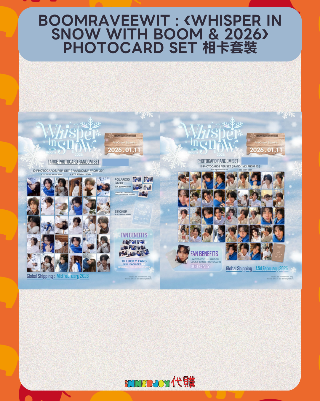 預購 | BoomRaveewit : ❮Whisper in Snow with Boom & 2026❯ Photocard Set 相卡套裝 【商品內容】 【A】Large Photocard Random Set 隨機大卡套裝 - B5大卡*10(30款隨機10款不重複) - 復刻版拍立得*2,(5款隨機2款) - A6貼紙*1 ✨凡於預售期內購買【A】將有機會得到原版拍立得,共十張✨ 【B】Photocard Random Set 隨機相卡套裝 - 相卡*10(40款隨機10款不重複) ✨凡於預售期內購買【B】將有機會得到限定隱藏版snow相卡,共300張✨ 📍書刊注意:產品可能會因運送過程有不可避免的磕碰或折角,如介意請慎買。📍 📌 International Customers Notice: If you are unsure about any product details, please contact us before placing your order. We’re happy to assist you! 🔸🔸🔸 Deadline|截止 : 24/01/2026 18:00 Earliest Delivery 預計最早發貨:Mid Feb 2月中旬 🔸🔸🔸 書刊購買須知: ⭐運送過程中雜誌可能會有不可避免的磕碰折角,出版商可不作售後更換,如介意請慎買。 ⭐出版商可能隨時改動書本設計和內容, InnerjoyThailand不作另行通知 ⭐內地雜誌出現需要售後的情況較多和部分銷售方有機會不提供售後或走數,請細閱網站內代購條款之圖片,下單即視為同意和知悉相關情況。 ⚠️備註:裝置屏幕顯示與拍攝時的顏色可能有差異,實際產品和參考圖片可能略有不同,望知悉。 🔸🔸🔸 ✨The product content is for reference only, and subject to the actual official sales situation. 📍商品內容僅供參考,一切以官方銷售實際情況作準。 ✨代購價格已包含泰國-香港路段國際郵費,香港本地可順豐到付,或到葵廣/旺角中心格仔鋪領取 ✨信用卡/八達通/ AlipayHK/WechatPay/Tap&Go/PayMe/ApplePay/GooglePay/Paypal/FPS/銀行轉帳✨ 🟠🟠🟠 Disclaimer: If the posting content infringes or violates your copyrights, please contact us immediately. 本公司並沒有持有任何品牌之版權,所有商標及版權均屬該品牌持有人,圖片及資料轉載只作分享用途,敬請留意。