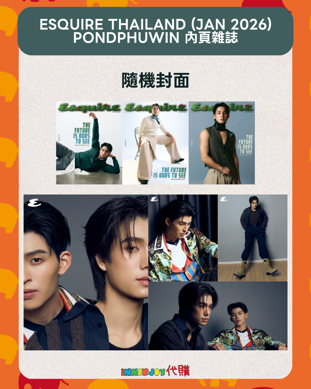 預購 | Esquire Thailand (January 2026) PondPhuwin 內頁雜誌 ✨請注意:PondPhuwin為雜誌內頁,並非封面✨ 📌 International Customers Notice: If you are unsure about any product details, please contact us before placing your order. We’re happy to assist you! 🔸🔸🔸 Deadline|截止 : Until Out of Stock 售完即止 Earliest Delivery 預計最早發貨:到貨後7 - 14日 🔸🔸🔸 書刊購買須知: ⭐運送過程中雜誌可能會有不可避免的磕碰折角,出版商可不作售後更換,如介意請慎買。 ⭐出版商可能隨時改動書本設計和內容, InnerjoyThailand不作另行通知 ⭐內地雜誌出現需要售後的情況較多和部分銷售方有機會不提供售後或走數,請細閱網站內代購條款之圖片,下單即視為同意和知悉相關情況。 ⚠️備註:裝置屏幕顯示與拍攝時的顏色可能有差異,實際產品和參考圖片可能略有不同,望知悉。 🔸🔸🔸 ✨The product content is for reference only, and subject to the actual official sales situation. 📍商品內容僅供參考,一切以官方銷售實際情況作準。 ✨代購價格已包含泰國-香港路段國際郵費,香港本地可順豐到付,或到葵廣/旺角中心格仔鋪領取 ✨信用卡/八達通/ AlipayHK/WechatPay/Tap&Go/PayMe/ApplePay/GooglePay/Paypal/FPS/銀行轉帳✨ 🟠🟠🟠 Disclaimer: If the posting content infringes or violates your copyrights, please contact us immediately. 本公司並沒有持有任何品牌之版權,所有商標及版權均屬該品牌持有人,圖片及資料轉載只作分享用途,敬請留意。
