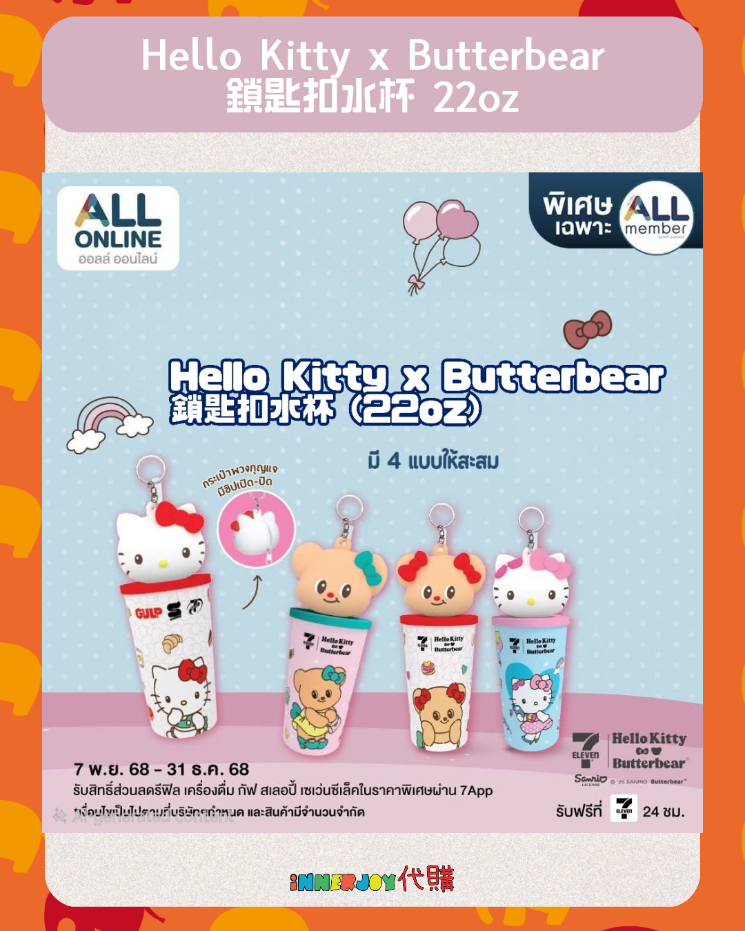 預購 | Hello Kitty x Butterbear 鎖匙扣水杯 22oz 【商品內容】 鎖匙扣水杯 鎖匙扣的頂部部分可以拉鏈打開 📌 International Customers Notice: If you are unsure about any product details, please contact us before placing your order. We’re happy to assist you! 🔸🔸🔸 Deadline|截止 : 20/11/2025 18:00 Earliest Delivery 預計最早發貨:Mid Dec 12月中旬 🔸🔸🔸 ✨The product content is for reference only, and subject to the actual official sales situation. 📍商品內容僅供參考,一切以官方銷售實際情況作準。 ✨代購價格已包含泰國-香港路段國際郵費,香港本地可順豐到付,或到葵廣/旺角中心格仔鋪領取 ✨信用卡/八達通/ AlipayHK/WechatPay/Tap&Go/PayMe/ApplePay/GooglePay/Paypal/FPS/銀行轉帳✨ 🟠🟠🟠 Disclaimer: If the posting content infringes or violates your copyrights, please contact us immediately. 本公司並沒有持有任何品牌之版權,所有商標及版權均屬該品牌持有人,圖片及資料轉載只作分享用途,敬請留意。