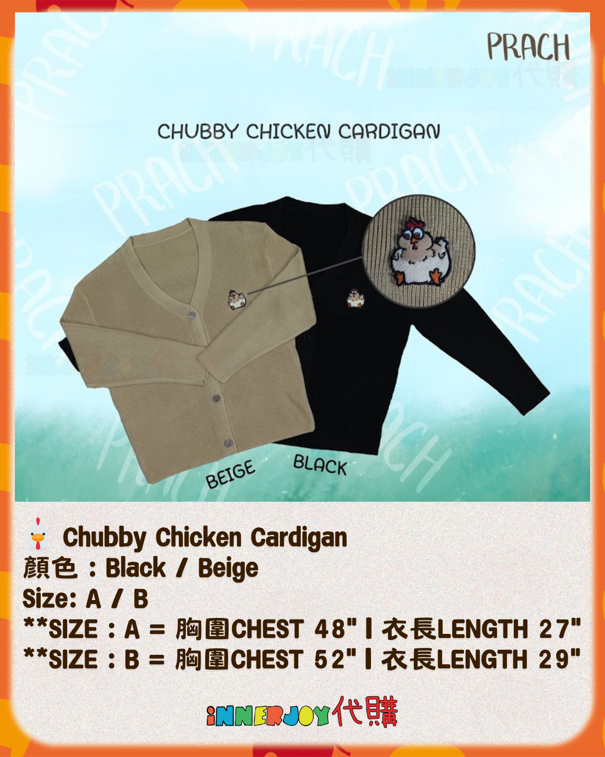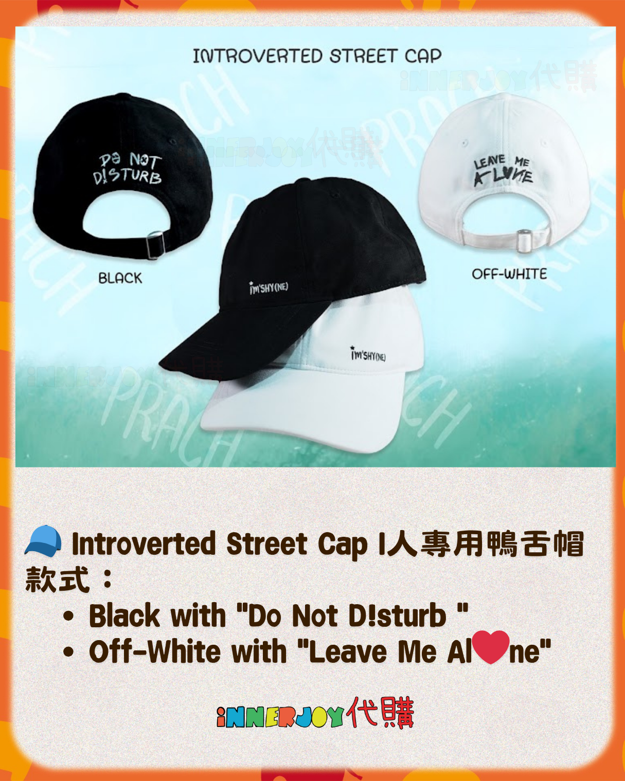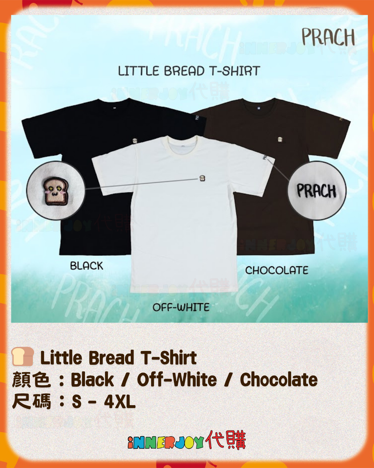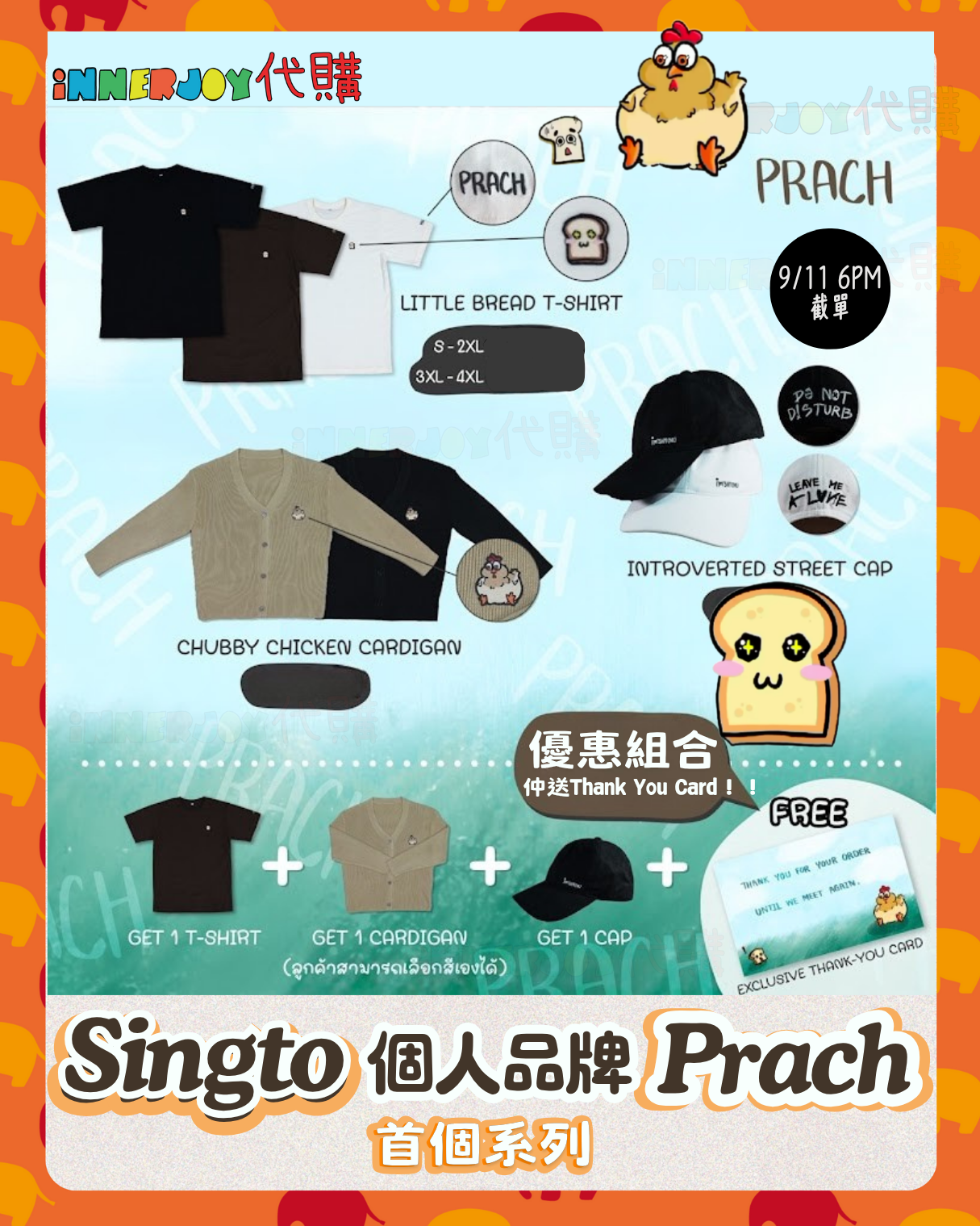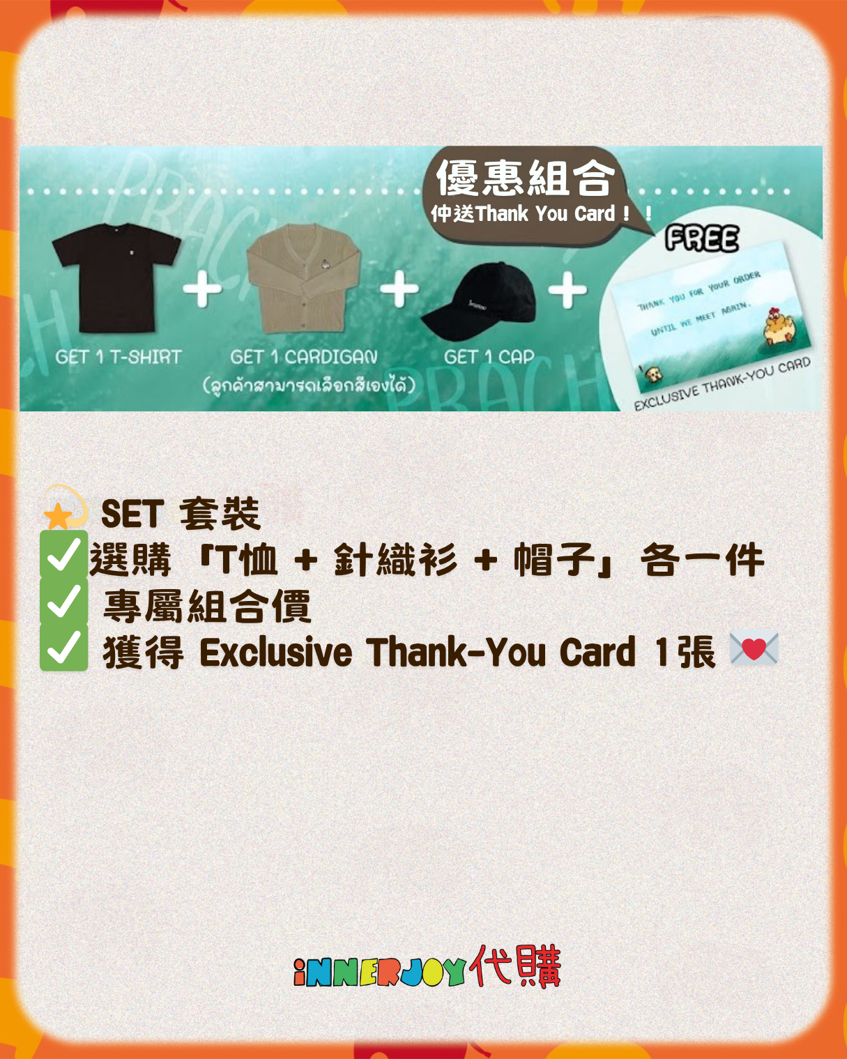 泰星代購 | KristSingto- Singto 個人品牌 PRACH Official 選擇組合時,記得備註3款產品各自的顏色和尺碼喔~❤︎ 【商品選擇:4款】 🍞 Little Bread T-Shirt 顏色 : Black / Off-White / Chocolate 尺碼:S - 4XL 🐔 Chubby Chicken Cardigan 顏色 : Black / Beige Size: A / B **SIZE : A = 胸圍CHEST 48" | 衣長LENGTH 27" **SIZE : B = 胸圍CHEST 52" | 衣長LENGTH 29" 🧢 Introverted Street Cap I人專用鴨舌帽 款式:Black with "Do Not D!sturb " / Off-White with "Leave Me Al❤︎ne" 💫 SET 套裝 ✅「T恤 + 針織衫 + 帽子」各一件 ✅Special Bundle Offer 優惠組合(贈卡片) ✅ 專屬組合價 ✅ 免費獲得 Exclusive Thank-You Card 1張 💌 🔸🔸🔸 Deadline|截止 : 9/11/2025 18:00 Earliest Delivery 預計最早發貨:12月初開始發貨,預計1個月 ■ 歡迎團購/合單|Group order is available. DM for details 凡購買 10 件以上,可領取團購優惠,歡迎粉絲和各大Fansclub查詢 🔸🔸🔸 書刊購買須知: ⭐運送過程中雜誌可能會有不可避免的磕碰折角,出版商可不作售後更換,如介意請慎買。 ⭐出版商可能隨時改動書本設計和內容, InnerjoyThailand不作另行通知 ⭐內地雜誌出現需要售後的情況較多和部分銷售方有機會不提供售後或走數,請細閱網站內代購條款之圖片,下單即視為同意和知悉相關情況。 ⚠️備註:裝置屏幕顯示與拍攝時的顏色可能有差異,實際產品和參考圖片可能略有不同,望知悉。 🔸🔸🔸 ✨The product content is for reference only, and subject to the actual official sales situation. 📍商品內容僅供參考,一切以官方銷售實際情況作準。 ✨代購價格已包含泰國-香港路段國際郵費,香港本地可順豐到付,或到葵廣/旺角中心格仔鋪領取 ✨信用卡/八達通/ AlipayHK/WechatPay/Tap&Go/PayMe/ApplePay/GooglePay/Paypal/FPS/銀行轉帳✨ 🟠🟠🟠 Disclaimer: If the posting content infringes or violates your copyrights, please contact us immediately. 本公司並沒有持有任何品牌之版權,所有商標及版權均屬該品牌持有人,圖片及資料轉載只作分享用途,敬請留意。