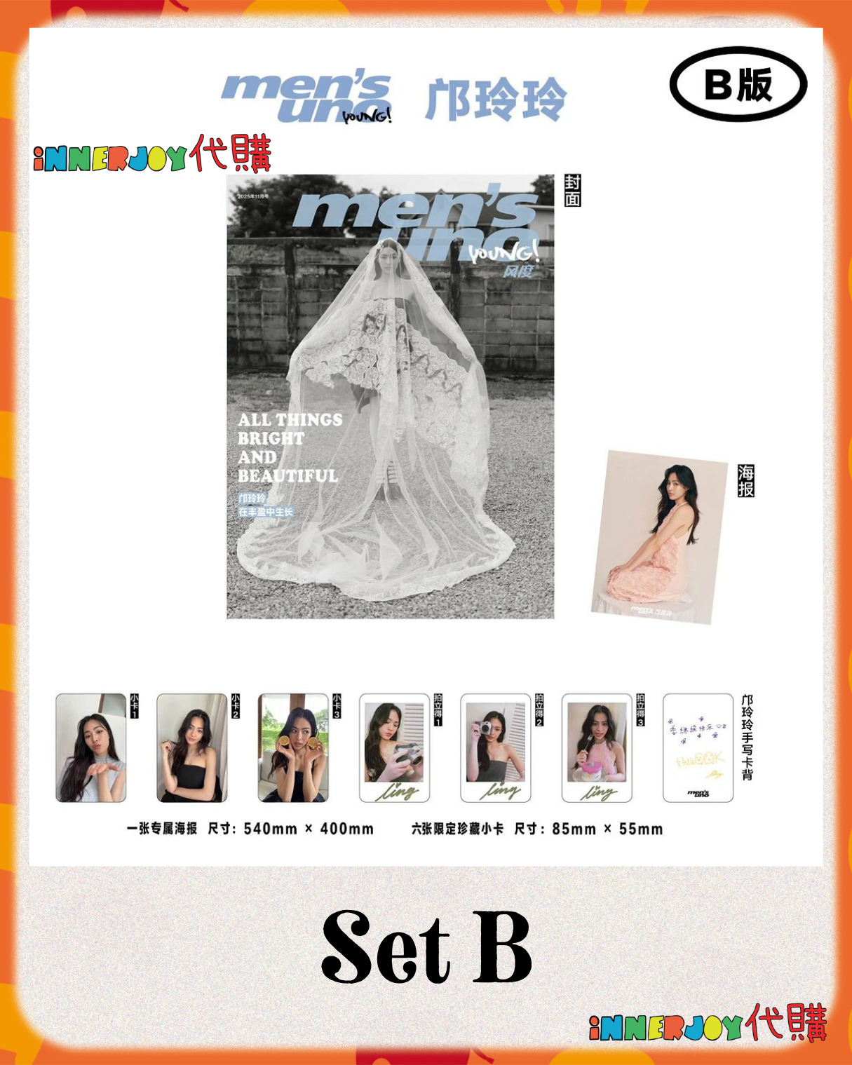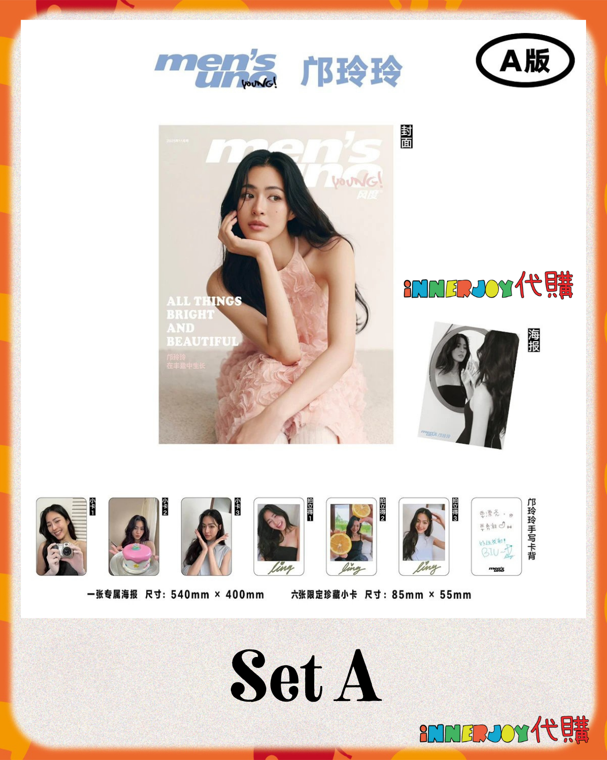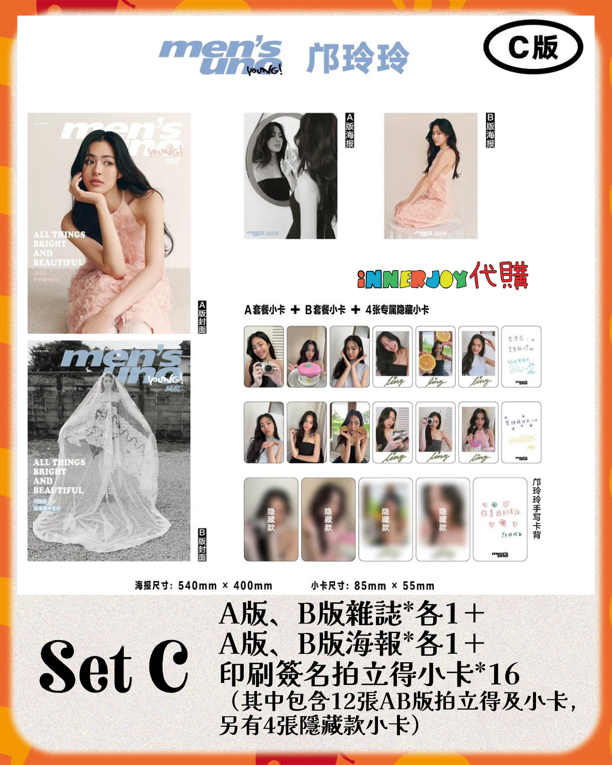 泰星代購 | LingOrm 代購 - LingLing x Men's Uno Young 風度 內地雜誌 Magazine 11月刊 2025 在Lingling的身上,獨立堅韌與柔和溫暖包容並蓄,共同造就了她那份獨特的鬆弛感。 【商品內容】 Set A : A版雜誌*1+ A版海報*1+ A版小卡*6 Set B :B版雜誌*1+ B版海報*1+ B版小卡*6 Set C : A版、B版雜誌*各1+ A版、B版海報*各1+ 印刷簽名拍立得7小卡*16 (其中包含12張AB版拍立得及小卡,另有4張隱藏款小卡) 💝 Set A : Cover A Magazine*1+ Ver.A Photocard*6 + Ver.A Poster 💝 Set B :Cover B Magazine*1+ Ver.B Photocard*6 + Ver.B Poster 💝 Set C : Cover A+ Cover B Magazine*1+ Poster A&B +Photocard*16 🌟 除雜誌封面、小卡、海報配置不同,刊物內容一樣🌟 🟠 產品為預購商品,付款後不支持任何退貨/退款,請謹慎下單 📍《內地雜誌購買須知》:本商品為特殊製售類商品,付款後不支持退貨/退款。下單即視為默認同意該規定,敬請諒解。 📍 內地雜誌類商品之重要說明: 雜誌商一般認為紙類製品在生產、運輸過程中,因無法完全排除與外部環境因素接觸與摩擦,產品表面可能會因此出現細微刮痕、小點、印痕等情況,這屬於出廠搬運、物流運輸等過程中難以避免的正常現象,並不影響商品的使用與其主要功能。因此,大部分雜誌商不願為上述之情況負責和提供售後,介意者請謹慎購買。 📍書刊購買須知: ⭐運送過程中雜誌可能會有不可避免的磕碰折角,出版商可不作售後更換,如介意請慎買。 ⭐出版商可能隨時改動書本設計和內容, InnerjoyThailand不作另行通知。 📍下單前請仔細閱讀本商品所有詳情 📍 Product details refer to the images ❗️最終解釋權為官方所有 ❗️裝置屏幕顯示與拍攝時的顏色可能有差異,實際產品和參考圖片可能略有不同,望知悉。 🔸🔸🔸 Deadline|截止 : 26/10/2025 18:00 Earliest Delivery 預計最早發貨:12月30開始出貨,1月中下旬到貨;官方如有延遲,如有更改將於限時動態(Story)內公佈。 🔸🔸🔸 ✨The product content is for reference only, and subject to the actual official sales situation. 商品內容僅供參考,一切以官方銷售實際情況作準。✨ ✨代購價格已包含泰國-香港路段國際郵費,香港本地可順豐到付,或到葵廣/旺角中心格仔鋪領取 ✨信用卡/八達通/ AlipayHK/WechatPay/Tap&Go/PayMe/ApplePay/GooglePay/Paypal/FPS/銀行轉帳✨ 🟠🟠🟠 ⚠️代購溫馨提示⚠️ 由於匯率浮動,價格有機會有所更改,敬請注意 購買前請閱讀網站置頂之「退貨及退款政策」 客人提交訂單後,視為知悉海關抽查之可能情況並同意政策。 海關抽查檢驗時,包裝會因海關打開而有機會出現破損,本店不會為海關檢查造成的各種情況與問題負責,敬請諒解。 預售產品及代購訂單不接受任何因素退款或退貨,為保障雙方,開箱前可全程開始拍影片檢視貨品狀況。 由於泰國運輸及包裝容易破損,難以避免出現產品存在人為無法干預的細微瑕疵情況。因此,本店所有代購商品均為出廠即存在瑕疵。所有商品如有輕微刮痕、輕微折角、輕微氣泡等不影響閱讀和觀感的問題均未能提供售後處理,拍下即同意本條說明。如對瑕疵介意的粉絲,請在下單之前慎重考慮,敬請留意。 美妝/保養/食品類產品由於衛生問題,開封後不接受任何退換或退款。 Disclaimer: If the posting content infringes or violates your copyrights, please contact us immediately. 本公司並沒有持有任何品牌之版權,所有商標及版權均屬該品牌持有人,圖片及資料轉載只作分享用途,敬請留意。