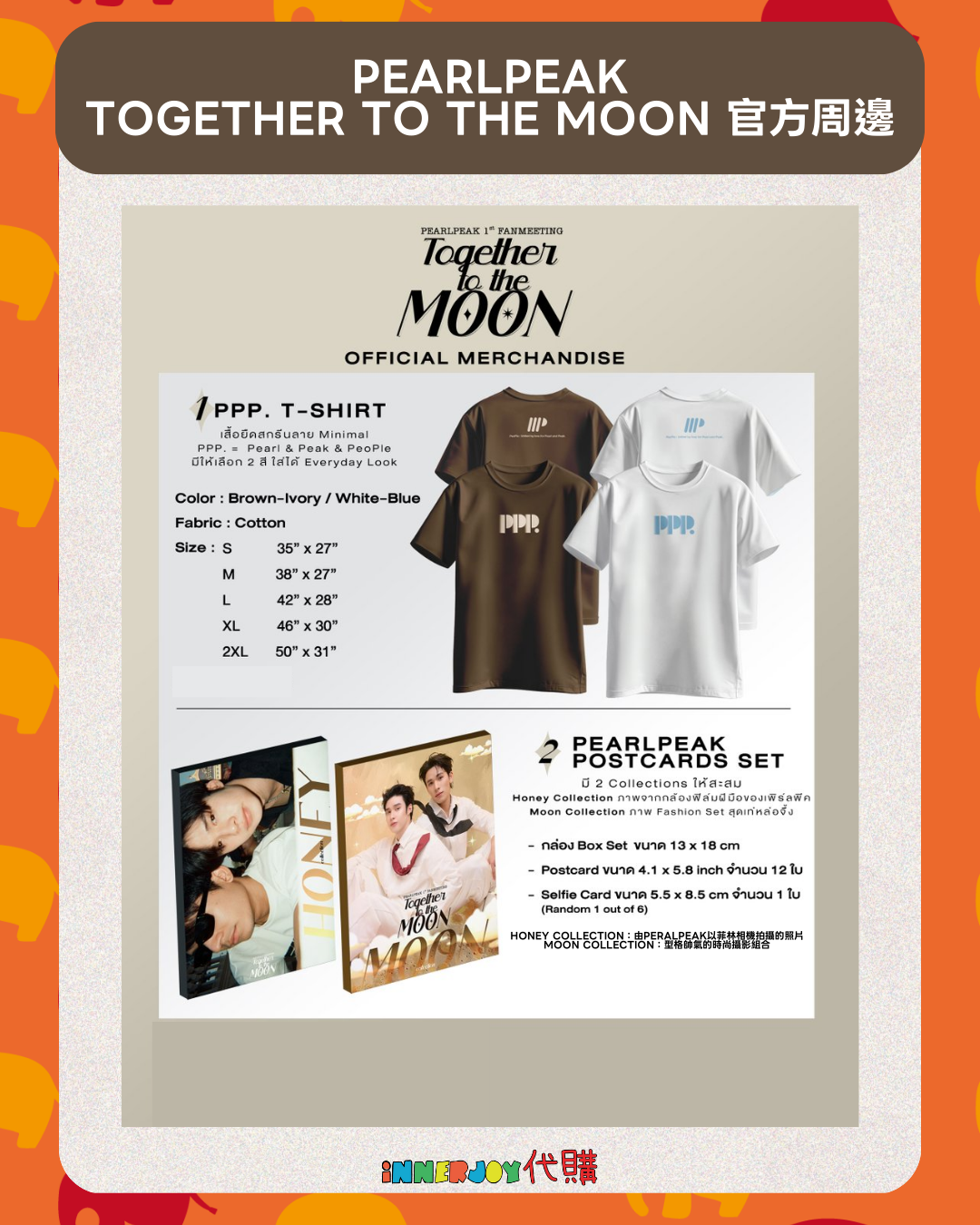 預購 | PearlPeak - Together to the Moon OFFICIAL MERCHANDISE 官方周邊 請注意:閣下一旦成功提交訂單,即表示了解並同意是次訂購之運送安排、付款須知及條款細則。請確保訂購數量及選項資料完全正確;訂單一經提交後不能取消,並不設任何退款及更改。 【商品內容】 1) PPP. T-SHIRT PPP. = Pearl & Peak & PeoPle Color: Brown-Ivory / White-Blue 尺碼 S (胸寬35″ X 衣長27″) M (胸寬38″ X 衣長27″) L (胸寬42″ X 衣長28″) XL (胸寬46″ X 衣長30″) 2XL (胸寬50″ X 衣長31″) 2) PEARLPEAK POSTCARDS SET 明信片套裝 款式: Honey Collection / Moon Collection - 13 x 18 cm Box Set - 4.1 x 5.8 inch Postcard (12 EA) - 5.5 x 8.5 cm Selfie Card (Random 1 out of 6) 📌 International Customers Notice: If you are unsure about any product details, please contact us before placing your order. We’re happy to assist you! 🔸🔸🔸 Deadline|截止 : 30/01/2026 18:00 Earliest Delivery 預計最早發貨:Mid March 3月中旬 🔸🔸🔸 書刊購買須知: ⭐運送過程中雜誌可能會有不可避免的磕碰折角,出版商可不作售後更換,如介意請慎買。 ⭐出版商可能隨時改動書本設計和內容, InnerjoyThailand不作另行通知 ⭐內地雜誌出現需要售後的情況較多和部分銷售方有機會不提供售後或走數,請細閱網站內代購條款之圖片,下單即視為同意和知悉相關情況。 ⚠️備註:裝置屏幕顯示與拍攝時的顏色可能有差異,實際產品和參考圖片可能略有不同,望知悉。 🔸🔸🔸 ✨The product content is for reference only, and subject to the actual official sales situation. 📍商品內容僅供參考,一切以官方銷售實際情況作準。 ✨代購價格已包含泰國-香港路段國際郵費,香港本地可順豐到付,或到葵廣/旺角中心格仔鋪領取 ✨信用卡/八達通/ AlipayHK/WechatPay/Tap&Go/PayMe/ApplePay/GooglePay/Paypal/FPS/銀行轉帳✨ 🟠🟠🟠 Disclaimer: If the posting content infringes or violates your copyrights, please contact us immediately. 本公司並沒有持有任何品牌之版權,所有商標及版權均屬該品牌持有人,圖片及資料轉載只作分享用途,敬請留意。