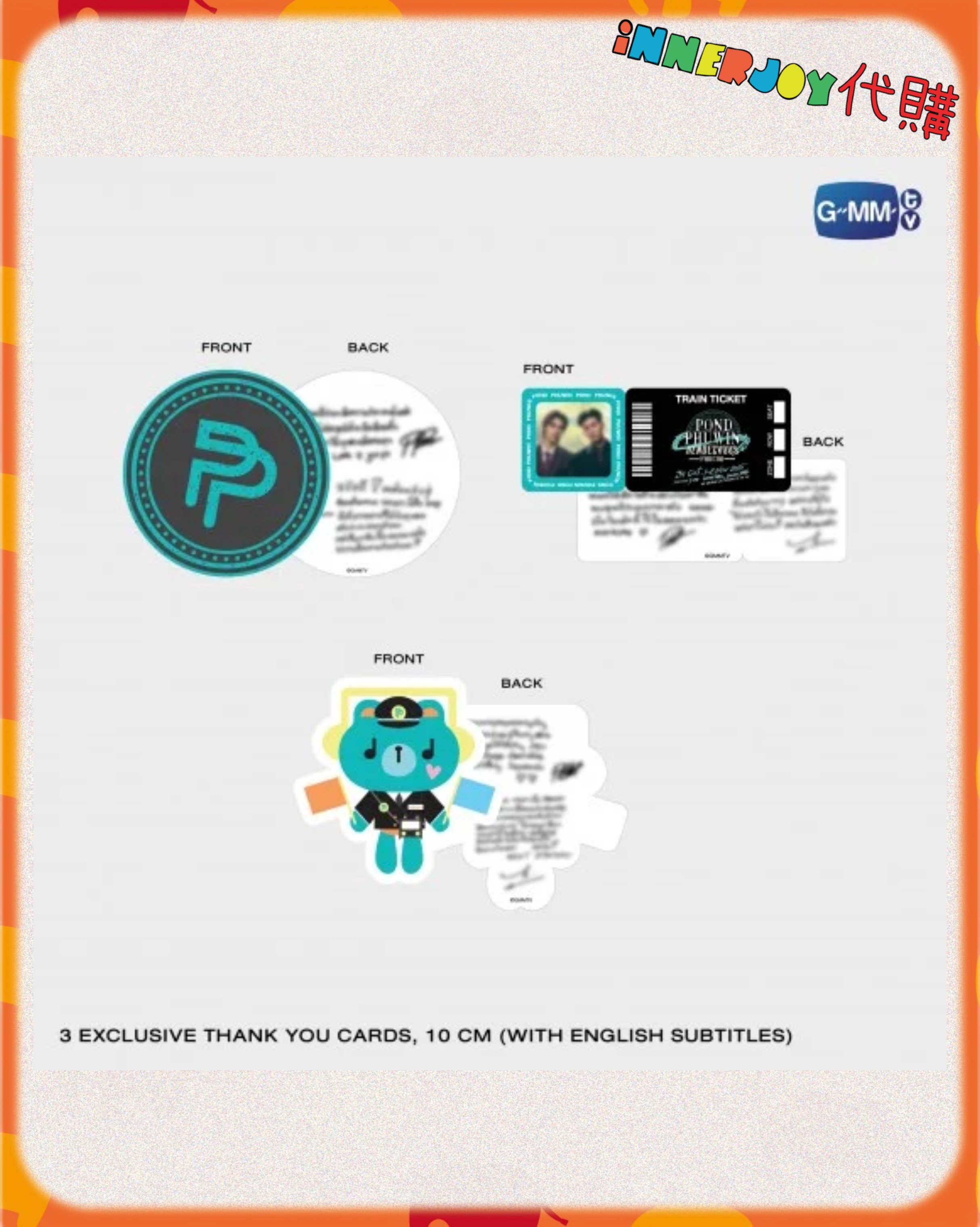 - Exclusive Thank You Cards: Set of 3 as distributed at the ‘POND PHUWIN RENDEZVOUS FANCON’ special reprinted exclusively for this boxset with English captions, 10 cm